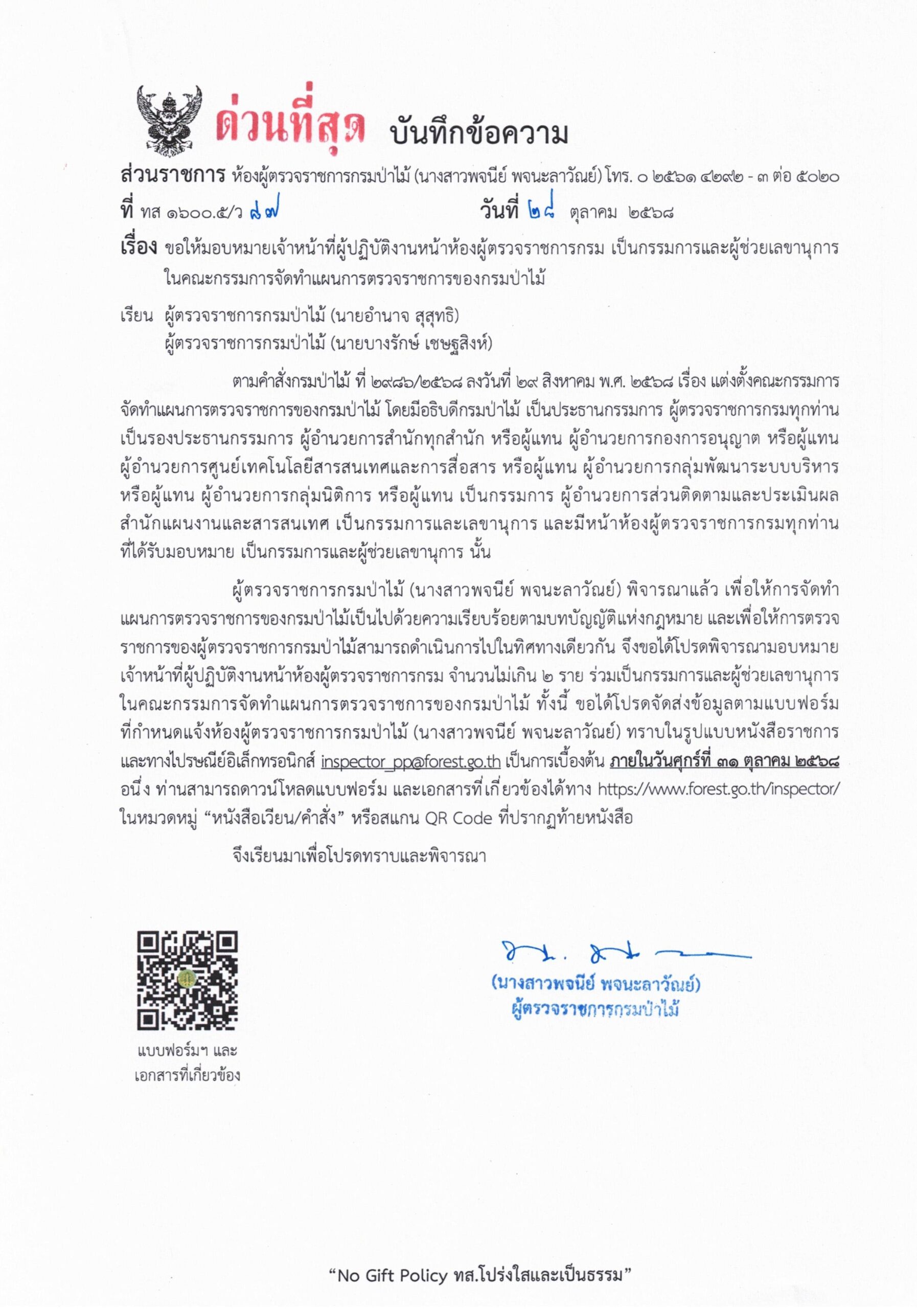 ทส 1600.5/ว 73 ลว. 7 ต.ค. 68 เรื่อง การมอบหมายผู้แทนผู้อำนวยการสำนัก/กอง/กลุ่ม/ศูนย์ ในคณะกรรมการจัดทำแผนการตรวจราชการของกรมป่าไม้