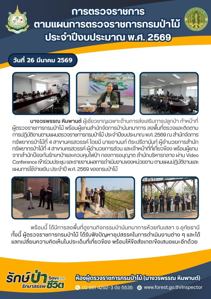 กิจกรรมผู้ตรวจราชการกรม วันที่ 26 มีนาคม 2569 ผู้ตรวจราชการป่าไม้ ลงพื้นที่ตรวจและติดตามการปฏิบัติงาน ตามแผนตรวจราชการกรมป่าไม้ ประจำปีงบประมาณ พ.ศ.2569 ณ สำนักจัดการทรัพยากรป่าไม้ที่ 4 สาขานครสวรรค์ by wasinee|เผยแพร่แล้ว มีนาคม 26, 2026