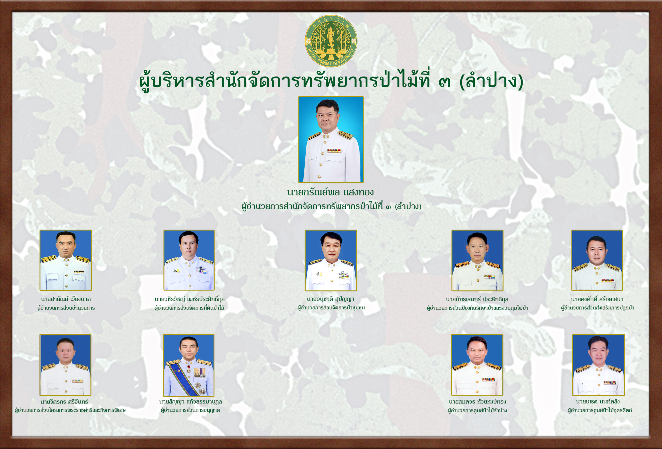 บอร์ดผู้บริหาร สจป3ลำปาง แนวนอน ใส่กรอบไม้ bg ลายพราง 12112568 by สำนักจัดการทรัพยากรป่าไม้ที่ ๓ (ลำปาง)|เผยแพร่แล้ว 14 พฤศจิกายน 2025-ณ มิติ 2560 × 1736 Images navigation Previous Next