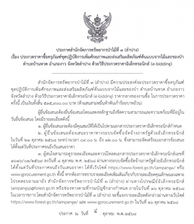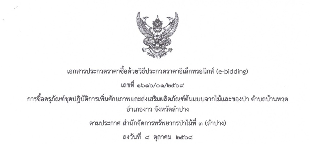 จัดซื้อจัดจ้าง เอกสารประกวดราคาซื้อด้วยวิธีประกวดราคาอิเล็กทรอนิกส์ (e-bidding) เลขที่ 1616/01/2569 การซื้อครุภัณฑ์ชุดปฏิบัติการเพิ่มศักยภาพและส่งเสริมผลิตภัณฑ์ต้นแบบจากไม้และของป่า ตำบลบ้านหวด อำเภองาว จังหวัดลำปาง ประจำปีงบประมาณ พ.ศ.2569 วันที่ 8 ตุลาคม 2568 […]