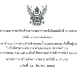 จัดซื้อจัดจ้าง เอกสารประกวดราคาจ้างด้วยการประกวดราคาอิเล็กทรอนิกส์ (e-bidding) เรื่อง ประกวดราคาจ้างเหมาโครงการสร้างฝายชะลอน้ำแบบผสมผสาน เพื่อฟื้นฟูระบบนิเวศ ในพื้นที่ป่าสงวนแห่งชาติ อำเภอแม่เมาะ จังหวัดลำปาง ประจำปีงบประมาณ พ.ศ. 2568 ด้วยวิธีประกวดราคาอิเล็กทรอนิกส์ (e-bidding) […]