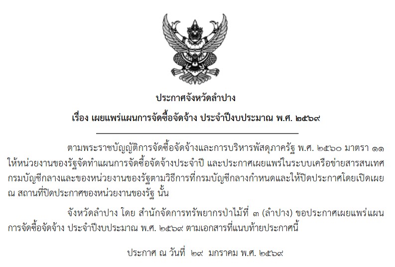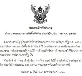 จัดซื้อจัดจ้าง ประกาศเผยแพร่แผนการจัดซื้อจัดจ้าง ประจำปีงบประมาณ พ.ศ. 2569 จ้างเหมาจัดทำแนวกันไฟในเขตพื้นที่ป่าสงวนแห่งชาติ จังหวัดลำปาง จำนวน 1,300 กิโลเมตร โครงการลำปางสุขภาพดี เมื่อไม่มีหมอกควัน กระบวนการขับเคลื่อนแก้ไขปัญหาหมอกควันไฟป่าจังหวัดลำปางแบบบูรณาการ ประจำปีงบประมาณ พ.ศ. 2569 […]