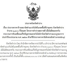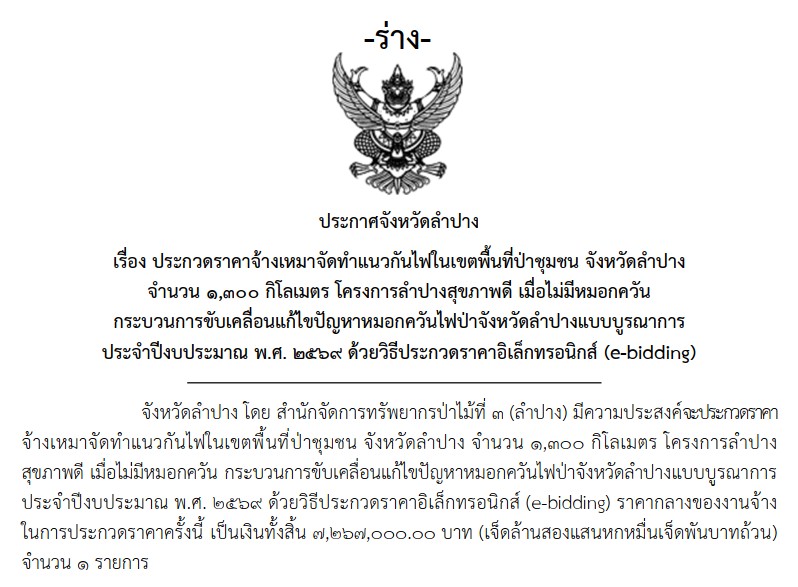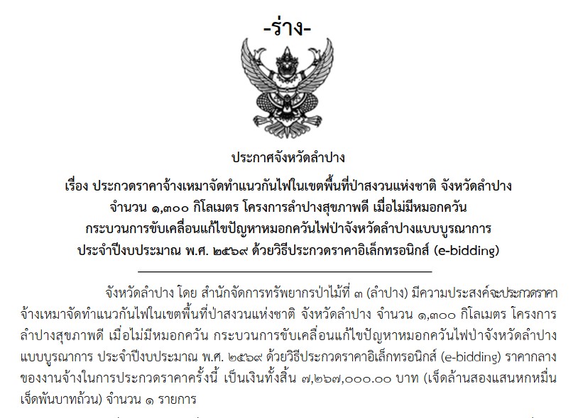 จัดซื้อจัดจ้าง ร่างประกาศจังหวัดลำปาง เรื่อง ประกวดราคาจ้างเหมาจัดทำแนวกันไฟในเขตพื้นที่ป่าชุมชน จังหวัดลำปาง จำนวน 1,300 กิโลเมตร โครงการลำปางสุขภาพดี เมื่อไม่มีหมอกควัน กระบวนการขับเคลื่อนแก้ไขปัญหาหมอกควันไฟป่าจังหวัดลำปางแบบบูรณาการ ประจำปีงบประมาณ พ.ศ. 2569 ด้วยวิธีประกวดราคาอิเล็กทรอนิกส์ (e-bidding) […]