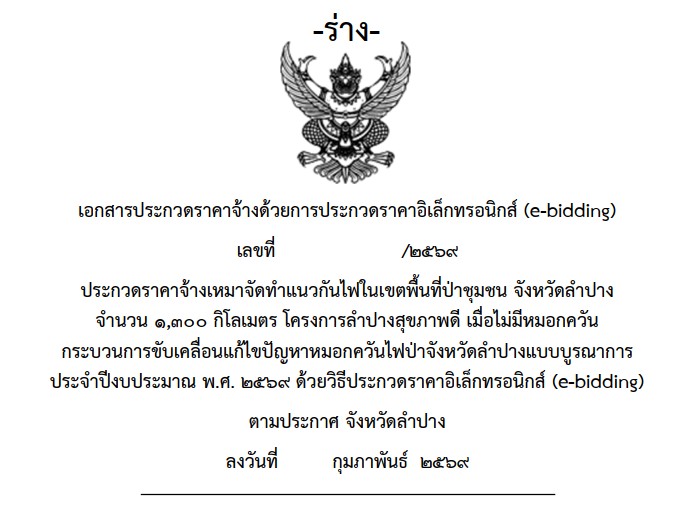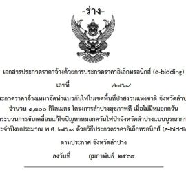 จัดซื้อจัดจ้าง ร่างเอกสารประกวดราคาจ้างด้วยการประกวดราคาอิเล็กทรอนิกส์ (e-bidding) เรื่อง ประกวดราคาจ้างเหมาจัดทำแนวกันไฟในเขตพื้นที่ป่าสงวนแห่งชาติ จังหวัดลำปาง จำนวน 1,300 กิโลเมตร โครงการลำปางสุขภาพดี เมื่อไม่มีหมอกควัน กระบวนการขับเคลื่อนแก้ไขปัญหาหมอกควันไฟป่าจังหวัดลำปางแบบบูรณาการ ประจำปีงบประมาณ พ.ศ. 2569 ด้วยวิธีประกวดราคาอิเล็กทรอนิกส์ (e-bidding) […]