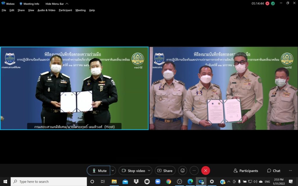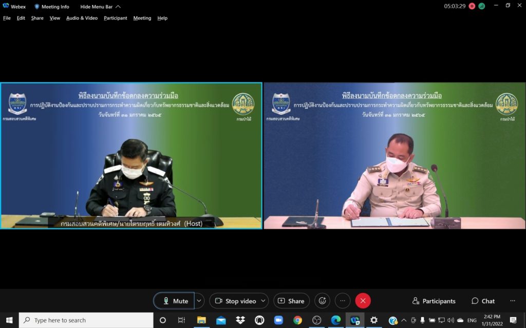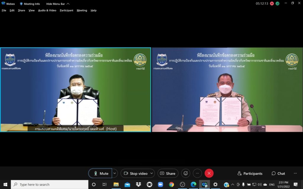 วันที่ 31 ม.ค. 2565 เวลา 14.30 น. นายสมศักดิ์ สกุลวรรณรักษ์ ผอ.สจป.ที่ 3 (ลำปาง) มอบหมายให้ นายเกษม คำมา ผู้อำนวยการส่วนจัดการที่ดินป่าไม้ เข้าร่วมพิธีลงนามบันทึกข้อตกลงความร่วมมือการปฏิบัติงานป้องกันและปราบปรามการกระทำผิดเกี่ยวกับทรัพยากรธรรมชาติและสิ่งแวดล้อม ระหว่าง กรมสอบสวนคดีพิเศษ และ กรมป่าไม้ ผ่านระบบ Video Conference ณ ห้องประชุมศาลาราชพฤกษ์ สจป.ที่ 3(ลำปาง) โดยมี นายไตรยฤทธิ์ เตมหิวงศ์ อธิบดีกรมสอบสวนคดีพิเศษ และ นายสุรชัย อจลบุญ อธิบดีกรมป่าไม้ เป็นผู้ลงนาม