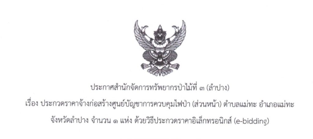 จัดซื้อจัดจ้าง ประกาศ เรื่อง ประกวดราคาจ้างก่อสร้างศูนย์บัญชาการควบคุมไฟป่า (ส่วนหน้า) ตำบลแม่ทะ อำเภอแม่ทะ จังหวัดลำปาง จำนวน 1 แห่ง ด้วยวิธีประกวดราคาอิเล็กทรอนิกส์ (e-bidding) by สำนักจัดการทรัพยากรป่าไม้ที่ ๓ (ลำปาง)|เผยแพร่แล้ว 3 มีนาคม 2025 ประกาศ เรื่อง ประกวดราคาจ้างก่อสร้างศูนย์บัญชาการควบคุมไฟป่า (ส่วนหน้า) ตำบลแม่ทะ อำเภอแม่ทะ จังหวัดลำปาง จำนวน 1 แห่ง ด้วยวิธีประกวดราคาอิเล็กทรอนิกส์ (e-bidding)