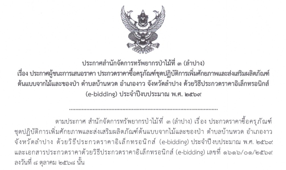 จัดซื้อจัดจ้าง ประกาศผู้ชนะการเสนอราคา ประกวดราคาซื้อครุภัณฑ์ชุดปฏิบัติการเพิ่มศักยภาพและส่งเสริมผลิตภัณฑ์ต้นแบบจากไม้และของป่า ตำบลบ้านหวด อำเภองาว จังหวัดลำปาง ด้วยวิธีประกวดราคาอิเล็กทรอนิกส์ (e-bidding) ประจำปีงบประมาณ พ.ศ. 2569 by สำนักจัดการทรัพยากรป่าไม้ที่ ๓ (ลำปาง)|เผยแพร่แล้ว 31 ตุลาคม 2025 ประกาศผู้ชนะการเสนอราคา ประกวดราคาซื้อครุภัณฑ์ชุดปฏิบัติการเพิ่มศักยภาพและส่งเสริมผลิตภัณฑ์ต้นแบบจากไม้และของป่า ตำบลบ้านหวด อำเภองาว จังหวัดลำปาง ด้วยวิธีประกวดราคาอิเล็กทรอนิกส์ (e-bidding) ประจำปีงบประมาณ พ.ศ. 2569 >>> รายละเอียดเอกสาร ประกาศผู้ชนะการเสนอราคา ประกวดราคาซื้อครุภัณฑ์ชุดปฏิบัติการเพิ่มศักยภาพและส่งเสริมผลิตภัณฑ์ต้นแบบจากไม้และของป่า ตำบลบ้านหวด อำเภองาว จังหวัดลำปาง ด้วยวิธีประกวดราคาอิเล็กทรอนิกส์ (e-bidding) ประจำปีงบประมาณ พ.ศ. 2569