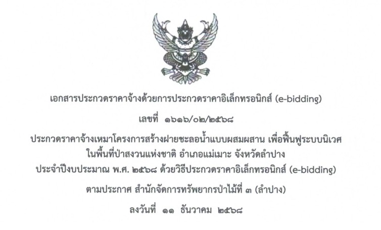 >>>>> รายละเอียด เอกสารประกวดราคาจ้างด้วยการประกวดราคาอิเล็กทรอนิกส์ (e-bidding) เรื่อง ประกวดราคาจ้างเหมาโครงการสร้างฝายชะลอน้ำแบบผสมผสาน เพื่อฟื้นฟูระบบนิเวศ ในพื้นที่ป่าสงวนแห่งชาติ อำเภอแม่เมาะ จังหวัดลำปาง ประจำปีงบประมาณ พ.ศ. 2568 ด้วยวิธีประกวดราคาอิเล็กทรอนิกส์ (e-bidding)