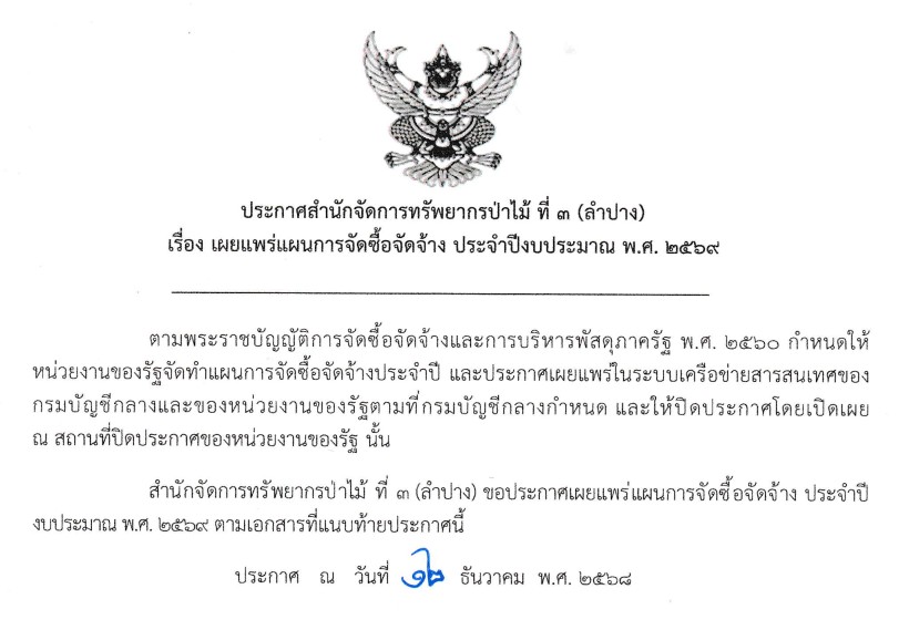 ประกาศเผยแพร่แผนโครงการจ้างก่อสร้างสำนักงานหน่วยป้องกันรักษาป่าที่ ลป.15 (แม่จางตอนใต้) ตำบลสันดอนแก้ว อำเภอแม่ทะ จังหวัดลำปาง