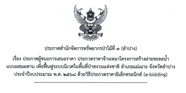 จัดซื้อจัดจ้าง เรื่อง ประกาศผู้ชนะการเสนอราคา ประกวดราคาจ้างเหมาโครงการสร้างฝายชะลอน้ำ แบบผสมผสาน เพื่อฟื้นฟูระบบนิเวศในพื้นที่ป่าสงวนแห่งชาติ อำเภอแม่เมาะ จังหวัดลำปาง ประจำปีงบประมาณ พ.ศ. 2568 ด้วยวิธีประกวดราคาอิเล็กทรอนิกส์ (e-bidding) by สำนักจัดการทรัพยากรป่าไม้ที่ ๓ (ลำปาง)|เผยแพร่แล้ว 22 ธันวาคม 2025 เรื่อง ประกาศผู้ชนะการเสนอราคา ประกวดราคาจ้างเหมาโครงการสร้างฝายชะลอน้ำแบบผสมผสาน เพื่อฟื้นฟูระบบนิเวศในพื้นที่ป่าสงวนแห่งชาติ อำเภอแม่เมาะ จังหวัดลำปาง ประจำปีงบประมาณ พ.ศ. 2568 ด้วยวิธีประกวดราคาอิเล็กทรอนิกส์ (e-bidding) >>>> รายละเอียด เรื่อง ประกาศผู้ชนะการเสนอราคา ประกวดราคาจ้างเหมาโครงการสร้างฝายชะลอน้ำแบบผสมผสาน เพื่อฟื้นฟูระบบนิเวศในพื้นที่ป่าสงวนแห่งชาติ อำเภอแม่เมาะ จังหวัดลำปาง ประจำปีงบประมาณ พ.ศ. 2568 ด้วยวิธีประกวดราคาอิเล็กทรอนิกส์ (e-bidding)