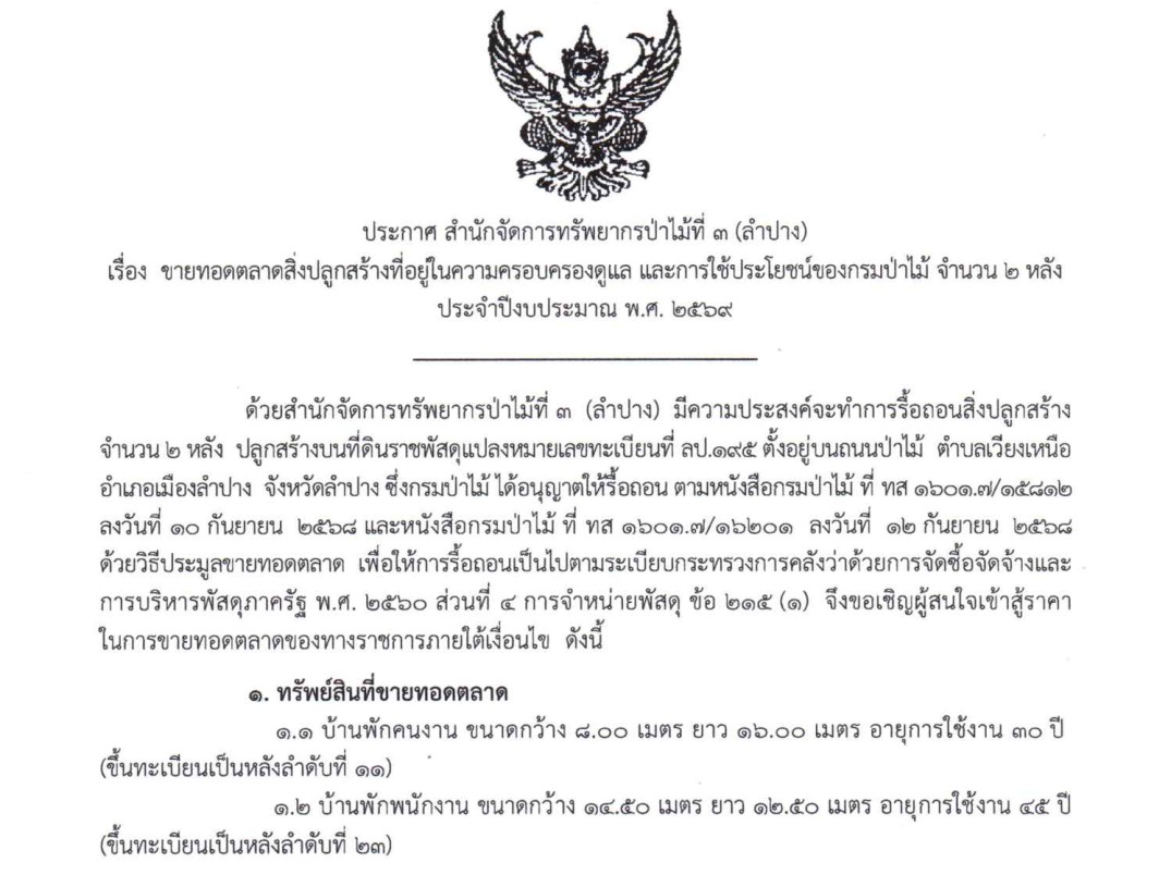 จัดซื้อจัดจ้าง ประกาศ เรื่อง ขายทอดตลาดสิ่งปลูกสร้างที่อยู่ในความครอบครองดูแล และการใช้ประโยชน์ของกรมป่าไม้ จำนวน 2 หลัง ประจำปีงบประมาณ พ.ศ. 2569 by สำนักจัดการทรัพยากรป่าไม้ที่ ๓ (ลำปาง)|เผยแพร่แล้ว 8 มกราคม 2026 ประกาศ เรื่อง ขายทอดตลาดสิ่งปลูกสร้างที่อยู่ในความครอบครองดูแล และการใช้ประโยชน์ของกรมป่าไม้ จำนวน 2 หลัง ประจำปีงบประมาณ พ.ศ. 2569 >>>>> รายละเอียด ประกาศ เรื่อง ขายทอดตลาดสิ่งปลูกสร้างที่อยู่ในความครอบครองดูแล และการใช้ประโยชน์ของกรมป่าไม้ จำนวน 2 หลัง ประจำปีงบประมาณ พ.ศ. 2569