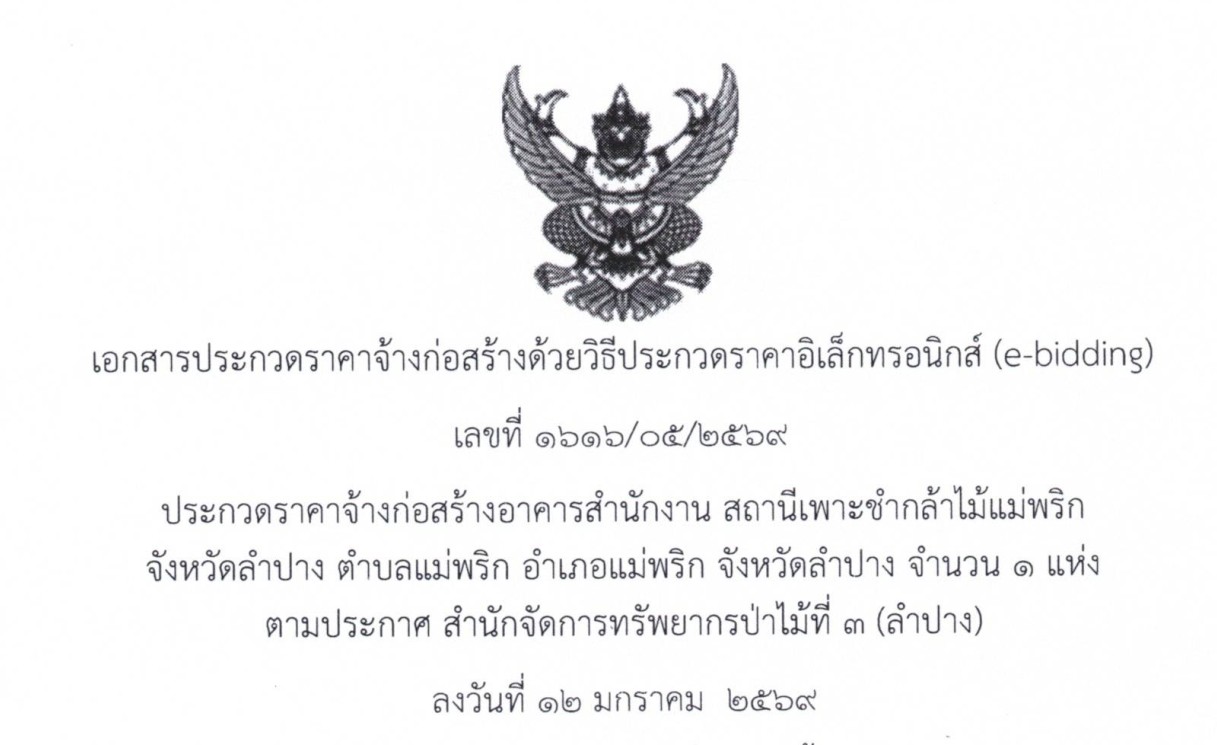 เอกสารประกวดราคาจ้างก่อสร้างด้วยวิธีประกวดราคาอิเล็กทรอนิกส์ (e-bidding) เลขที่ 1616/05/2569 ประกวดราคาจ้างก่อสร้างอาคารสำนักงาน สถานีเพาะชำกล้าไม้แม่พริก จังหวัดลำปาง ตำบลแม่พริก อำเภอแม่พริก จังหวัดลำปาง จำนวน ๑ แห่ง ตามประกาศ สำนักจัดการทรัพยากรป่าไม้ที่ ๓ (ลำปาง) ลงวันที่ 12 มกราคม ๒๕๖๙