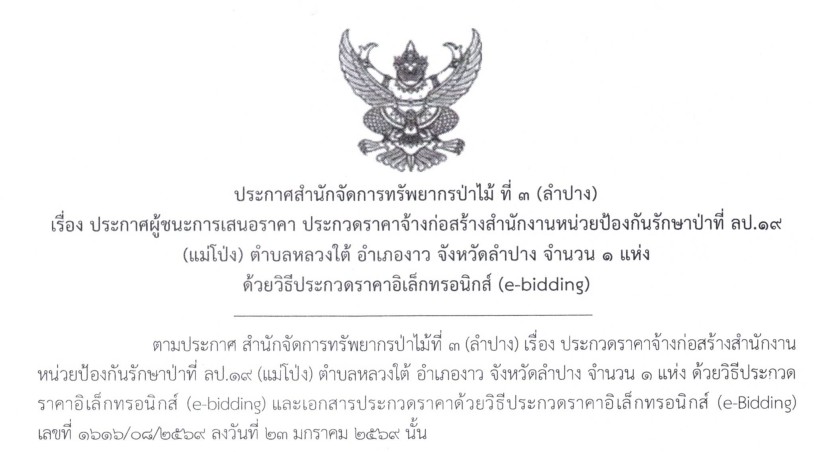 ประกาศสำนักจัดการทรัพยากรป่าไม้ ที่ 3 (ลำปาง) เรื่อง ประกาศผู้ชนะการเสนอราคา ประกวดราคาจ้างก่อสร้างสำนักงานหน่วยป้องกันรักษาป่าที่ ลป.19 (แม่โป่ง) ตำบลหลวงใต้ อำเภองาว จังหวัดลำปาง จำนวน 1 แห่ง ด้วยวิธีประกวดราคาอิเล็กทรอนิกส์ (e-bidding) ประกาศ ณ วันที่ 4 กุมภาพันธ์ พ.ศ. 2569