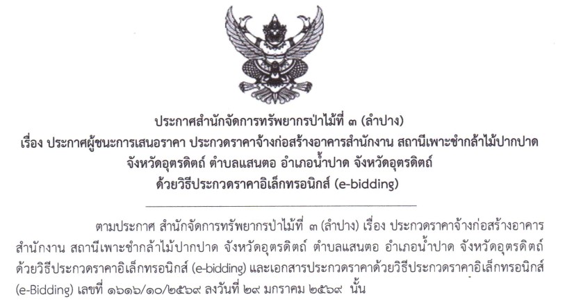 จัดซื้อจัดจ้าง ประกาศผู้ชนะการเสนอราคา ประกวดราคาจ้างก่อสร้างอาคารสำนักงาน สถานีเพาะชำกล้าไม้ปากปาด จังหวัดอุตรดิตถ์ ตำบลแสนตอ อำเภอน้ำปาด จังหวัดอุตรดิตถ์ ด้วยวิธีประกวดราคาอิเล็กทรอนิกส์ (e-bidding) by สำนักจัดการทรัพยากรป่าไม้ที่ ๓ (ลำปาง)|เผยแพร่แล้ว 23 กุมภาพันธ์ 2026 ประกาศผู้ชนะการเสนอราคา ประกวดราคาจ้างก่อสร้างอาคารสำนักงาน สถานีเพาะชำกล้าไม้ปากปาด จังหวัดอุตรดิตถ์ ตำบลแสนตอ อำเภอน้ำปาด จังหวัดอุตรดิตถ์ ด้วยวิธีประกวดราคาอิเล็กทรอนิกส์ (e-bidding) >>>>> ประกาศผู้ชนะการเสนอราคา ประกวดราคาจ้างก่อสร้างอาคารสำนักงาน สถานีเพาะชำกล้าไม้ปากปาด จังหวัดอุตรดิตถ์ ตำบลแสนตอ อำเภอน้ำปาด จังหวัดอุตรดิตถ์ ด้วยวิธีประกวดราคาอิเล็กทรอนิกส์ (e-bidding)