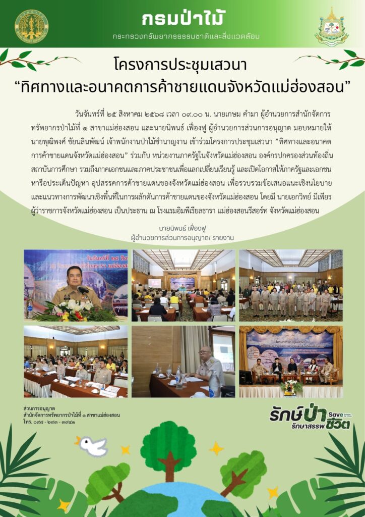 โครงการประชุมเสวนา ”ทิศทางและอนาคตการค้าชายแดนจังหวัดแม่ฮ่องสอน” วันจันทร์ที่ ๒๕ สิงหาคม ๒๕๖๘ เวลา ๐๙.๐๐ น. นายเกษม คำมา ผู้อำนวยการสำนักจัดการทรัพยากรป่าไม้ท่ี่ ๑ สาขาแม่ฮ่องสอน และนายนิพนธ์ เฟื่องฟู ผู้อำนวยการส่วนการอนุญาต มอบหมายให้ นายพุฒิพงศ์ ชัยนลินพัฒน์ เจ้าพนักงานป่าไม้ชำนาญงาน เข้าร่วมโครงการประชุมเสวนา ”ทิศทางและอนาคตการค้าชายแดนจังหวัดแม่ฮ่องสอน” ร่วมกับ หน่วยงานภาครัฐในจังหวัดแม่ฮ่องสอน องค์กรปกครองส่วนท้องถิ่น สถาบันการศึกษา รวมถึงภาคเอกชนและภาคประชาชน เพื่อแลกเปลี่ยนเรียนรู้และเปิดโอกาสให้ภาครัฐและเอกชนหารือประเด็นปัญหา อุปสรรคการค้าชายแดนของจังหวัดแม่ฮ่องสอน เพื่อรวบรวมข้อเสนอแนะเชิงนโยบายและแนวทางการพัฒนาเชิงพื้นที่ในการผลักดันการค้าชายแดนของจังหวัดแม่ฮ่องสอน โดยมี นายเอกวิทย์ มีเพียร ผู้ว่าราชการจังหวัดแม่ฮ่องสอน เป็นประธาน ณ โรงแรมอิมพีเรียลธารา แม่ฮ่องสอนรีสอร์ท จังหวัดแม่ฮ่องสอน Post Views: 46