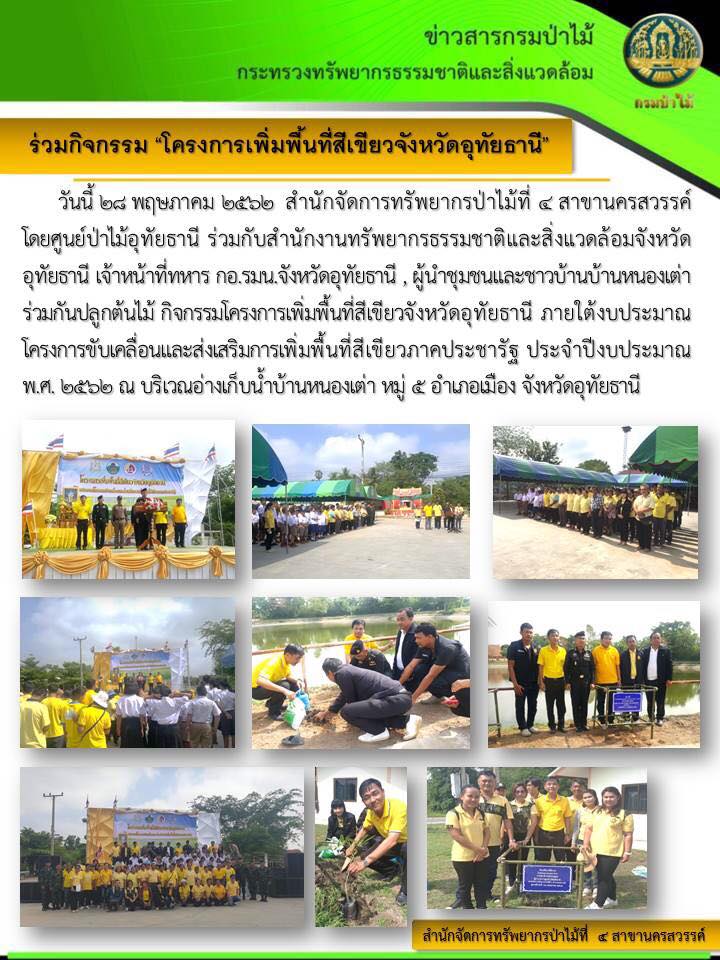 ร่วมกิจกรรมโครงการเพิ่มพื้นที่สีเขียวจังหวัดอุทัยธานี29 พฤษภาคม 2019 ใน ข่าว by amon วันที่ 28 พฤษภาคม 2562 ศูนย์ป่าไม้อุทัยธานีได้จัดกิจกรรมร่วมกับ สำนักงานทรัพยากรธรรมชาติและสิ่งแวดล้อมจังหวัดอุทัยธานี จัดกิจกรรมปลูกต้นไม้ ณ บริเวณรอบอ่างเก็บน้ำหนองเต่าหมู่ที่ 5 อำเภอเมือง จังหวัดอุทัยธานี Post Views: 433