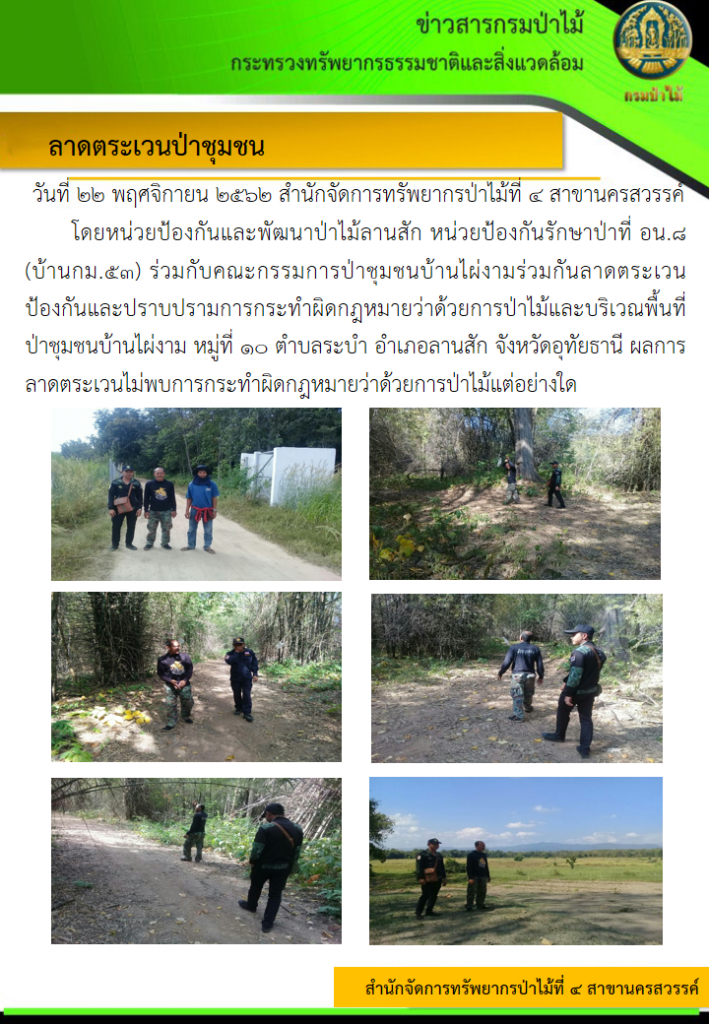 ลาดตระเวนป่าชุมชน บริเวณบ้านไผ่งาม ต.ระบำ อ.ลานสัก จ.อุทัยธานี25 พฤศจิกายน 2019 ใน ข่าว by amon Post Views: 674