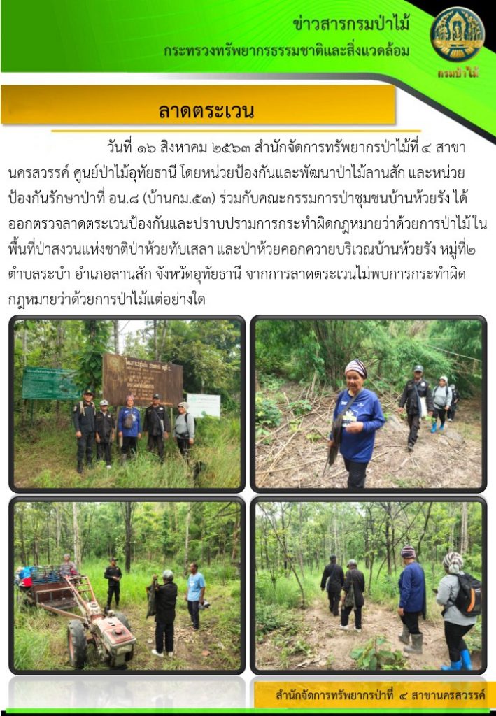 ลาดตระเวน พื้นที่ป่าสงวนแห่งชาติป่าห้วยทับเสลา และป่าห้วยคอกควาย บริเวณบ้านห้วยรัง18 สิงหาคม 2020 ใน ข่าว by amon Post Views: 544