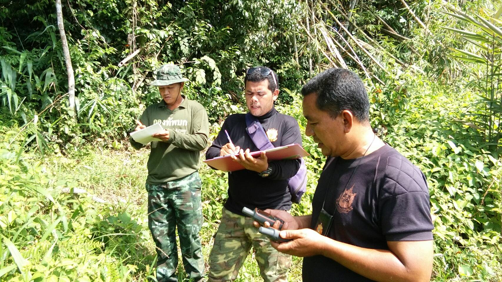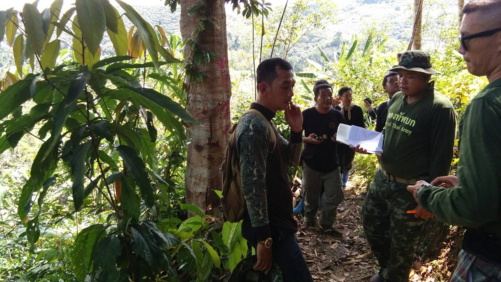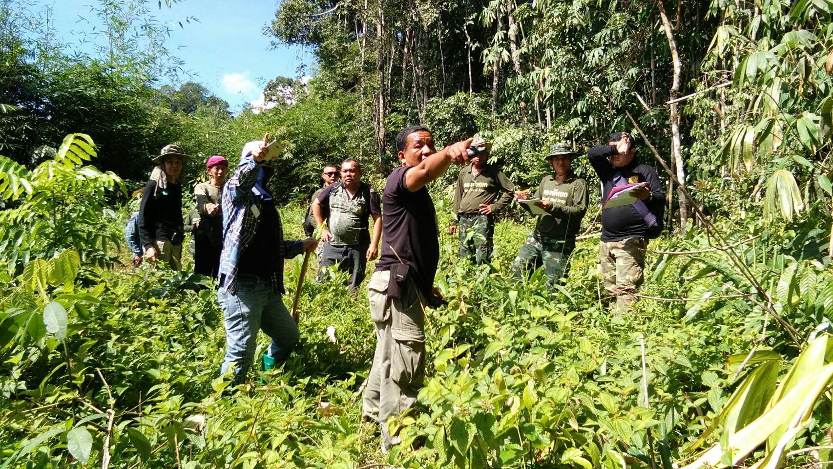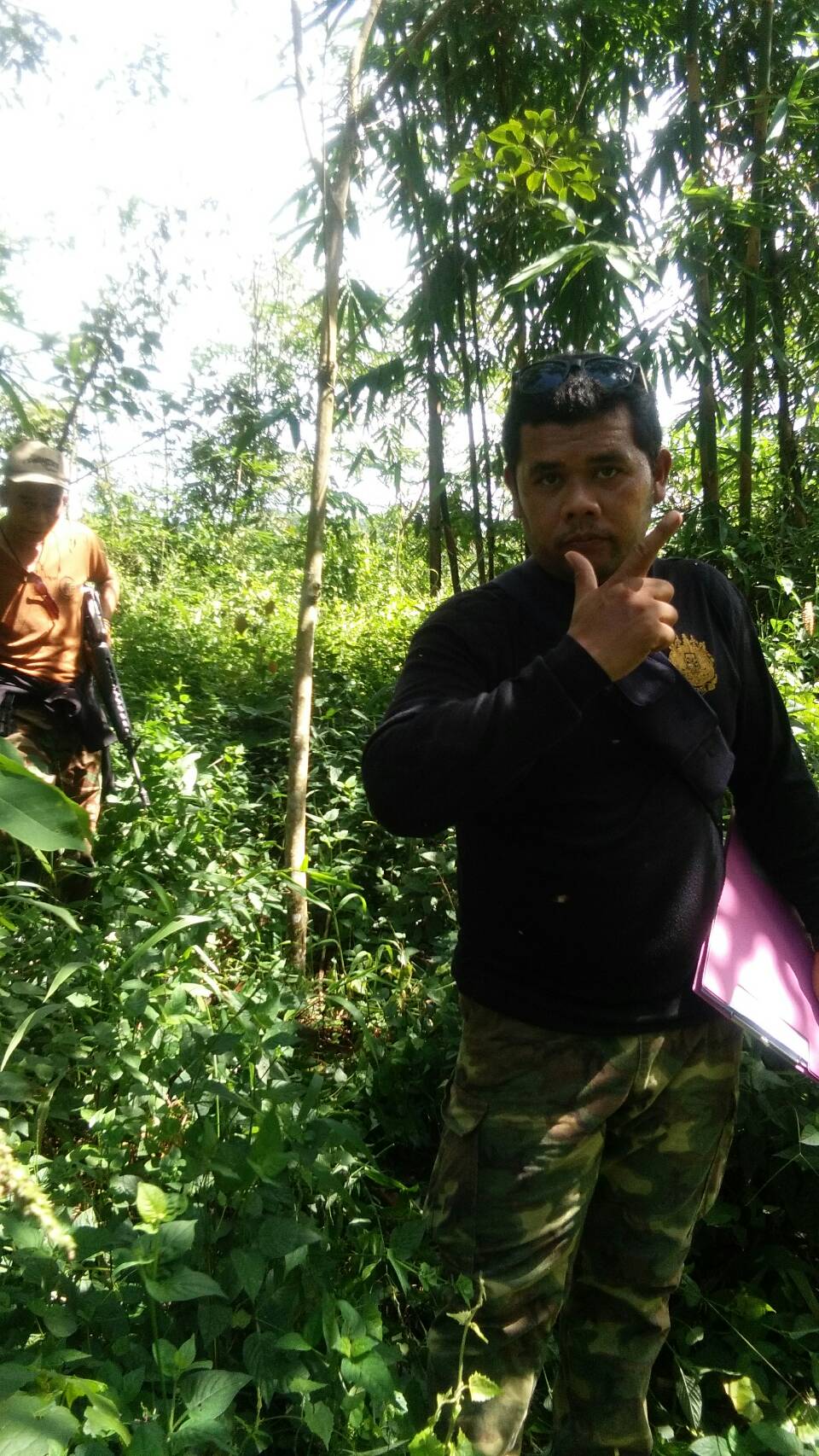 จ.ส.อ ทรงวุฒิ สุบรรณภาพ เจ้าหน้าที่ที่ดิน ผยย.มทบ๔๖ ร.ต มานพ หอมสุวรรณ กอ.รมน.จังหวัดยะลาพร้อมด้วยผู้ร่วมพัฒนาชาติไทย บ.ปิยมิตร๓ ร่วมกันออกตรวจสภาพป่า ในการที่กองทัพบกยื่นขอ ต่อใบอนุญาต ขอใช้ประโยชน์พื้นที่ป่าสงวนแห่งชาติ ป่าเบตง บ้านปิยมิตร ๓ ต.อัยเยอร์เวง อ.เบตง จ.ยะลา ต่อไปอีก ๓๐ ปี