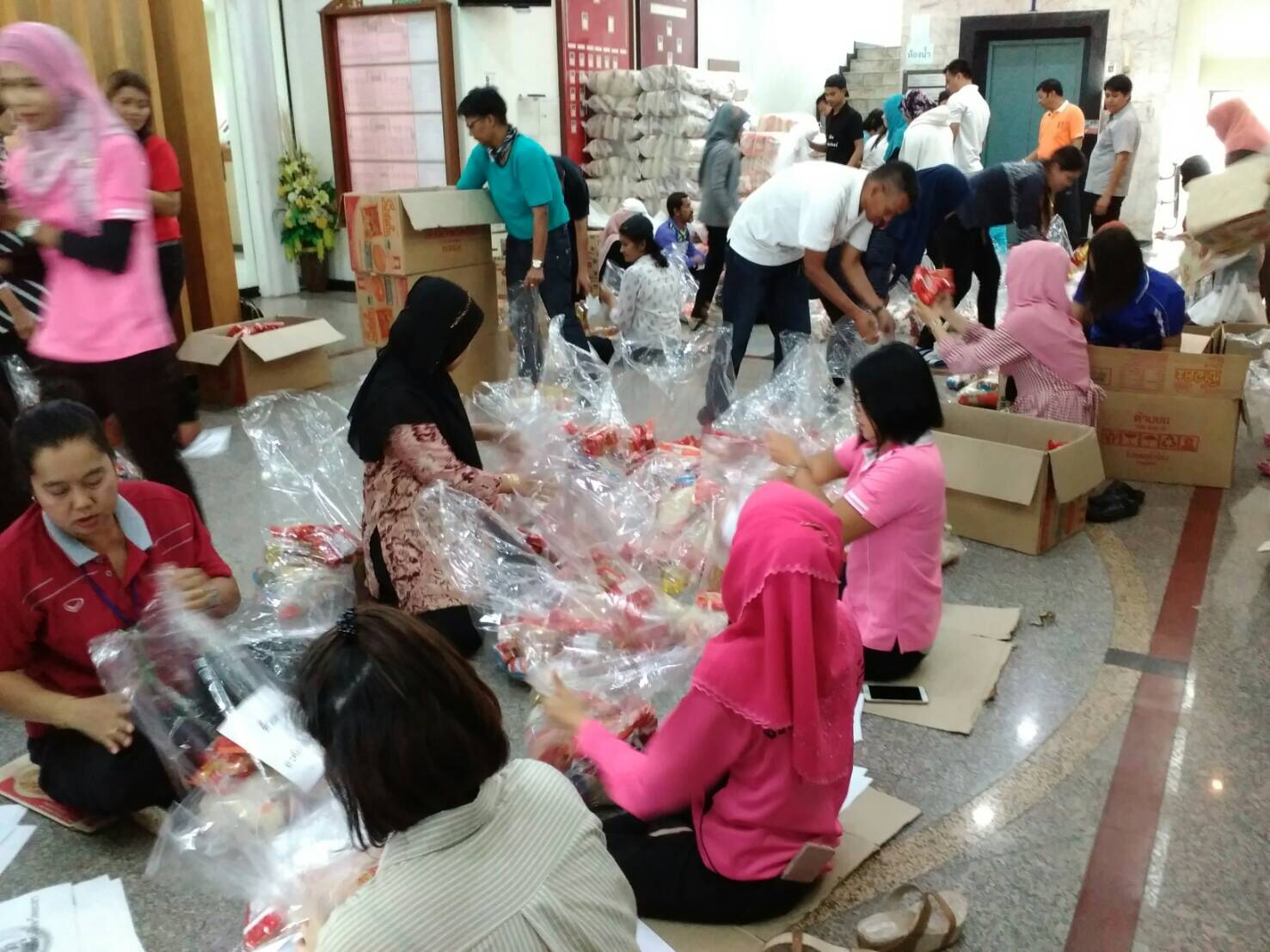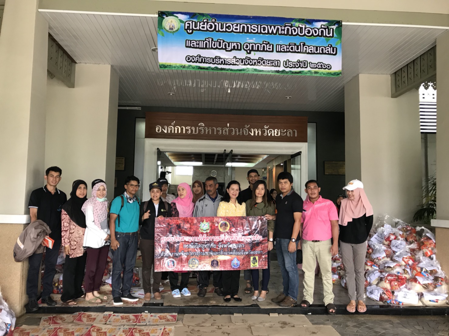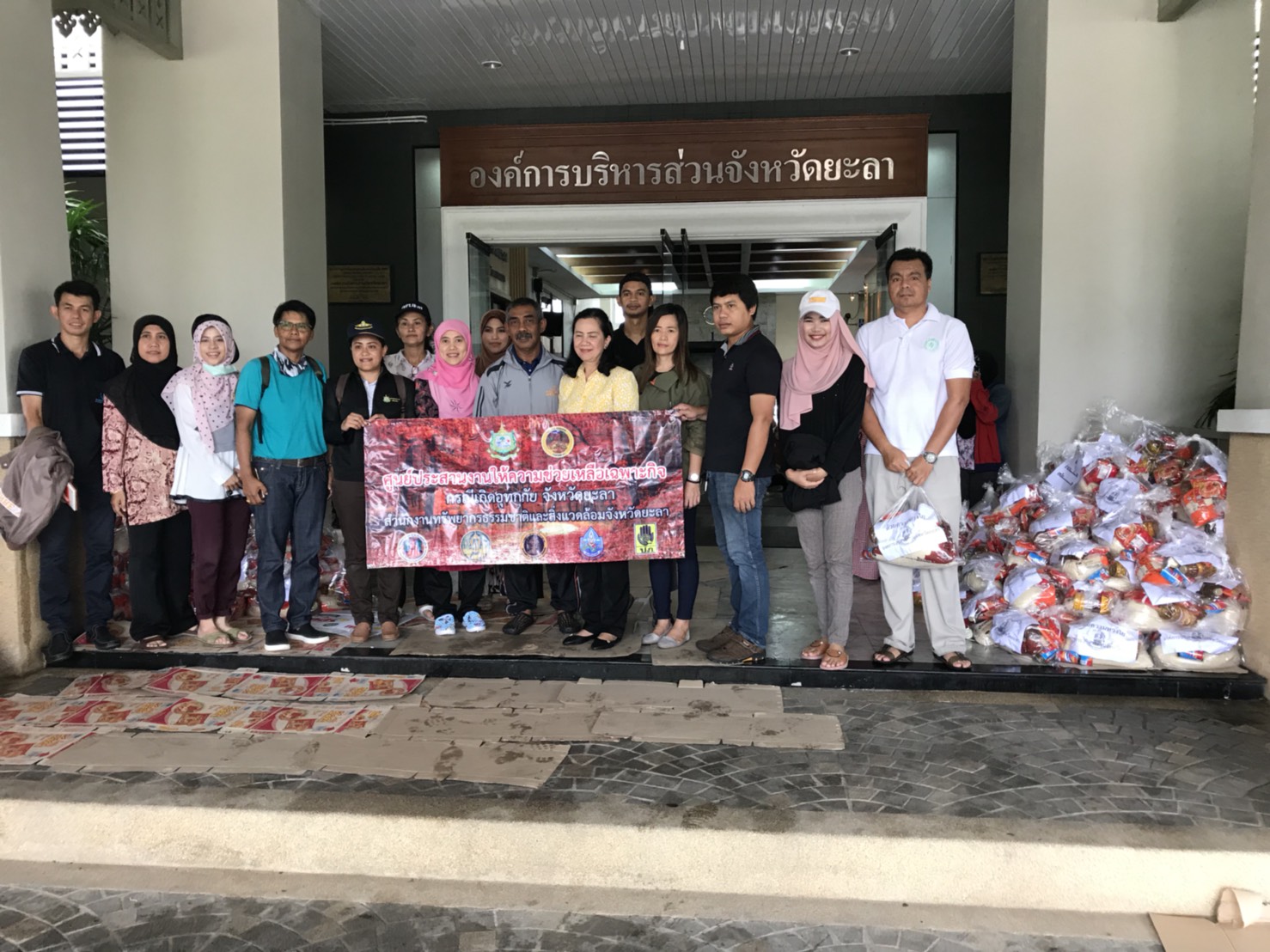 วันนี้ 28 พฤศจิกายน 2560 นางสาวกัลยา โตะแวอายี นักวิชาการสิ่งแวดล้อมชำนาญการพิเศษ รก. ผอ. สนง. ทสจ. ยะลา นำคณะเจ้าหน้าที่ สนง. ทสจ. ยะลา คณะกรรมการเครือข่าย ทสม. จังหวัดยะลา และเจ้าหน้าที่ศูนย์ประสานงานป่าไม้จังหวัดยะลา ไปร่วมจิตอาสา ช่วยกันบรรจุเครื่องบริโภค (ข้าวสาร ปลากระป๋อง น้ำมันพืช และมาม่า ซือดะ) ที่ศูนย์อำนวยการเฉพาะกิจป้องกันและแก้ไขปัญหา อุทกภัย และดินโคลนถ่ม องค์การบริหารส่วนจังหวัดยะลา เพื่อช่วยเหลือพี่น้องชาวยะลา ที่ประสบปัญหาอุทกภัยและดินโคลนถล่ม เนื่องจากฝนตกหนักอย่างต่อเนื่องมาหลายวันในพื้นที่จังหวัดยะลา ขอขอบคุณ องค์การบริหารส่วนจังหวัดยะลา ที่เตรียมมอบถุงยังชีพให้กับกับพี่น้องประชาชนที่ประสบภัย ในวันพรุ่งนี้