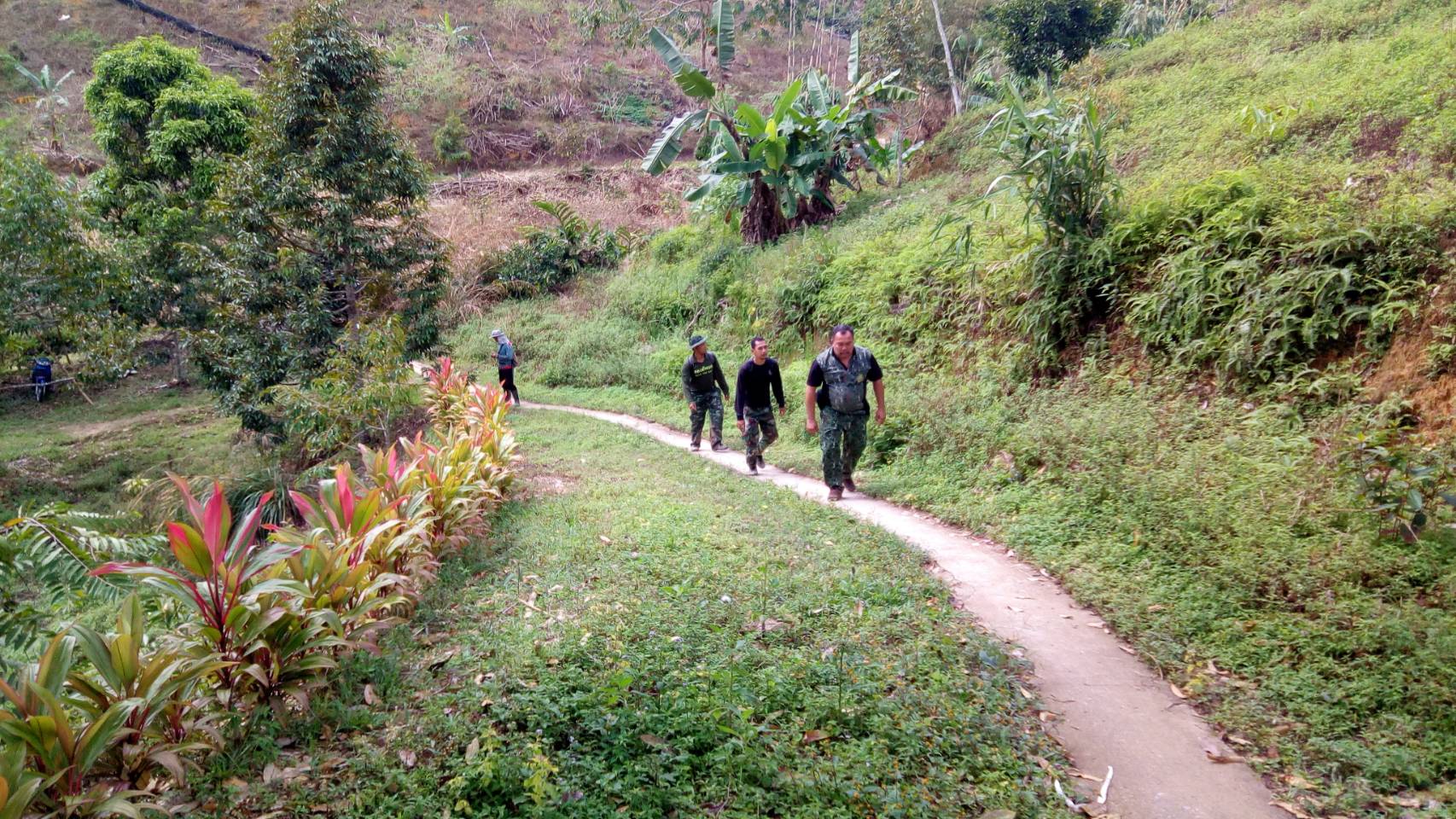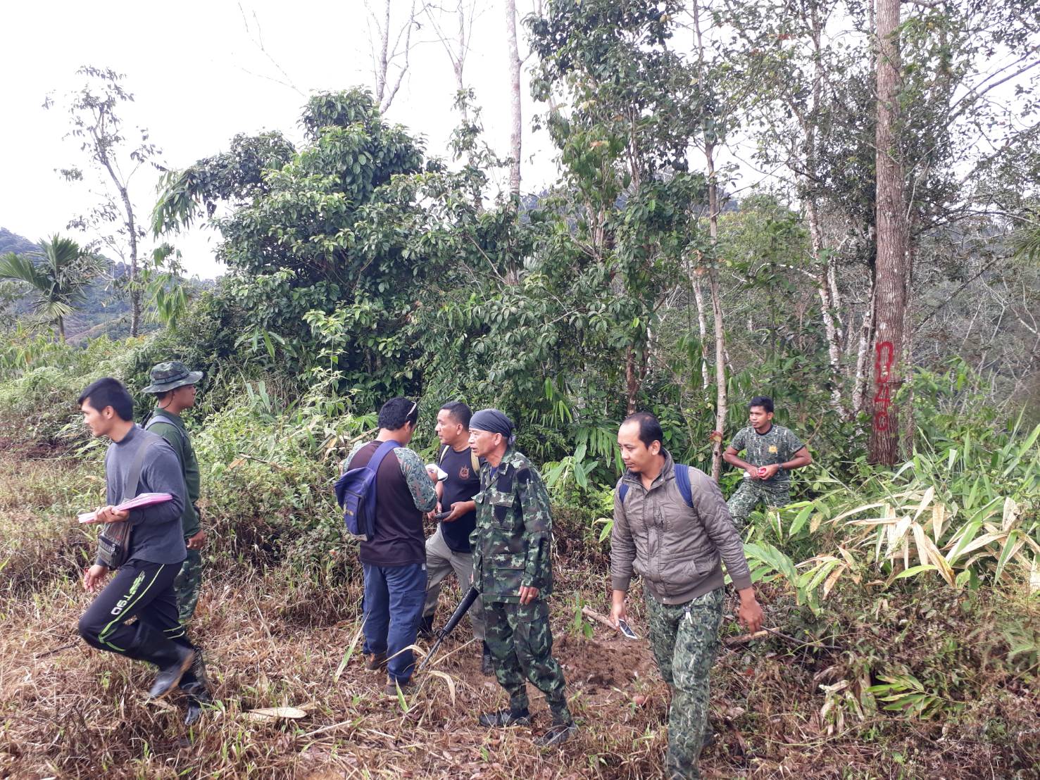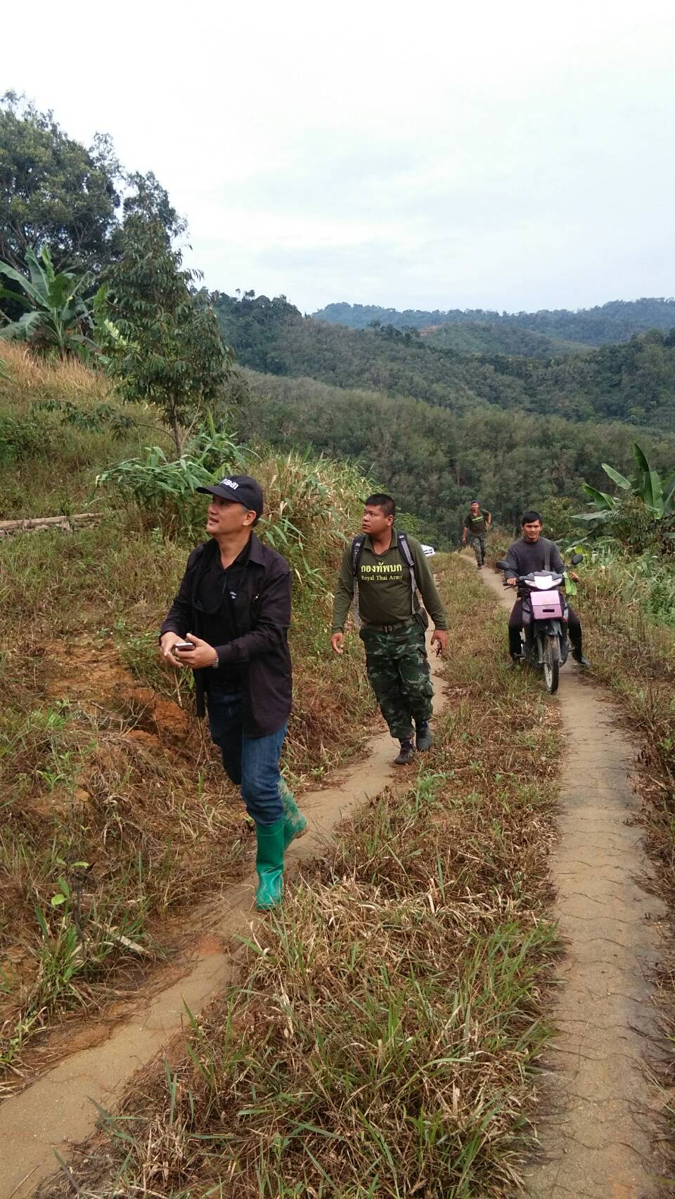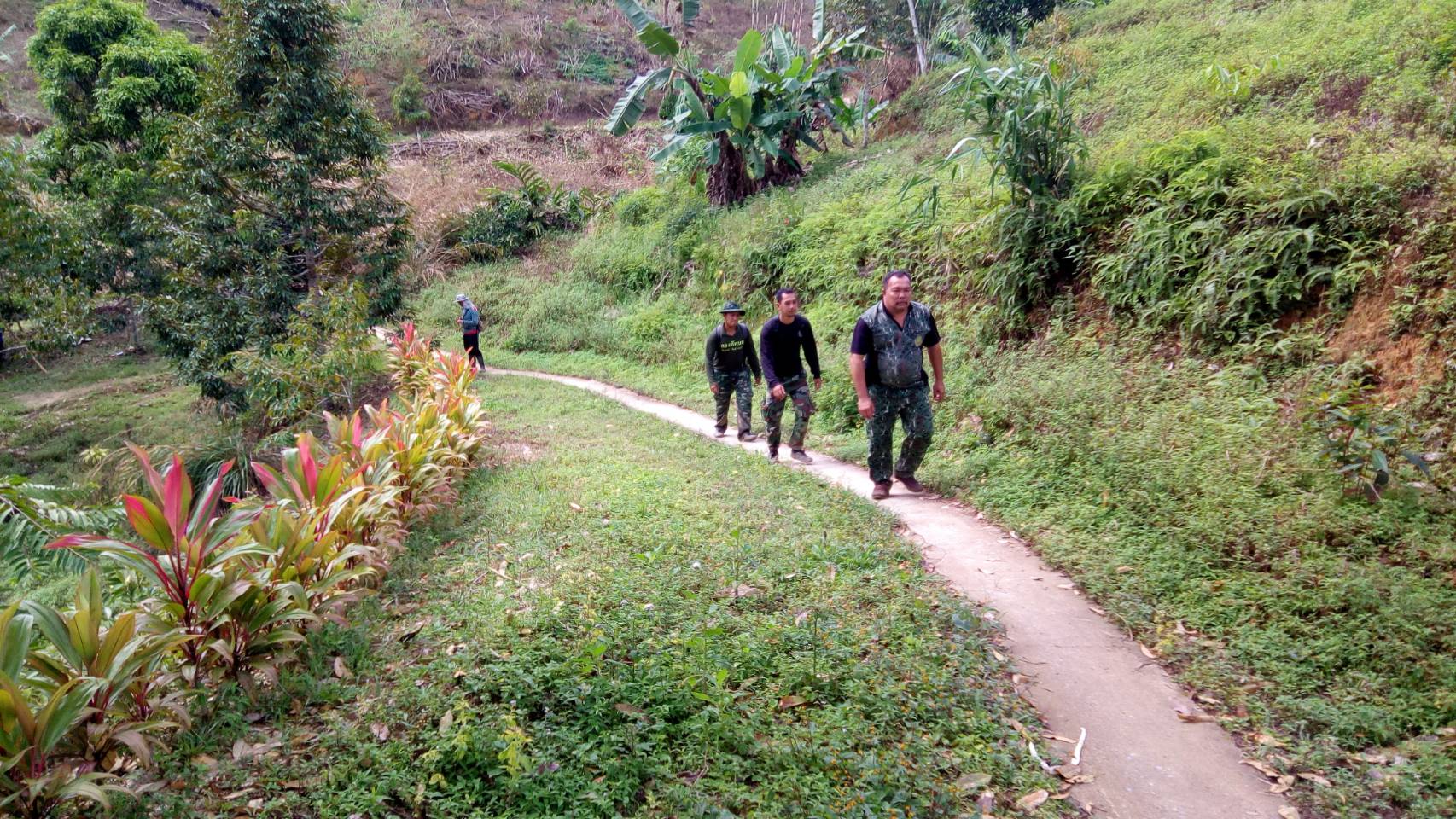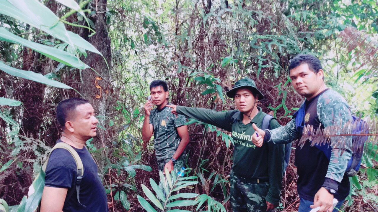 จ.ส.อ ทรงวุฒิ สุบรรณภาพ เจ้าหน้าที่ที่ดิน ผยย.มทบ๔๖ ร.ต มานพ หอมสุวรรณ กอ.รมน.จังหวัดยะลาพร้อมด้วยผู้ร่วมพัฒนาชาติไทย บ.ปิยมิตร๓ ร่วมกันออกตรวจสภาพป่า ในการที่กองทัพบกยื่นขอ ต่อใบอนุญาต ขอใช้ประโยชน์พื้นที่ป่าสงวนแห่งชาติ ป่าเบตง บ้านปิยมิตร ๒ต.ตาเนาะแมเราะ อ.เบตง จ.ยะลา ต่อไปอีก ๓๐ ปี