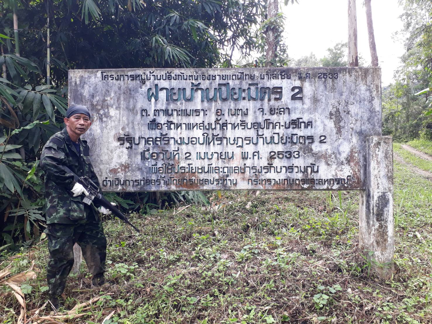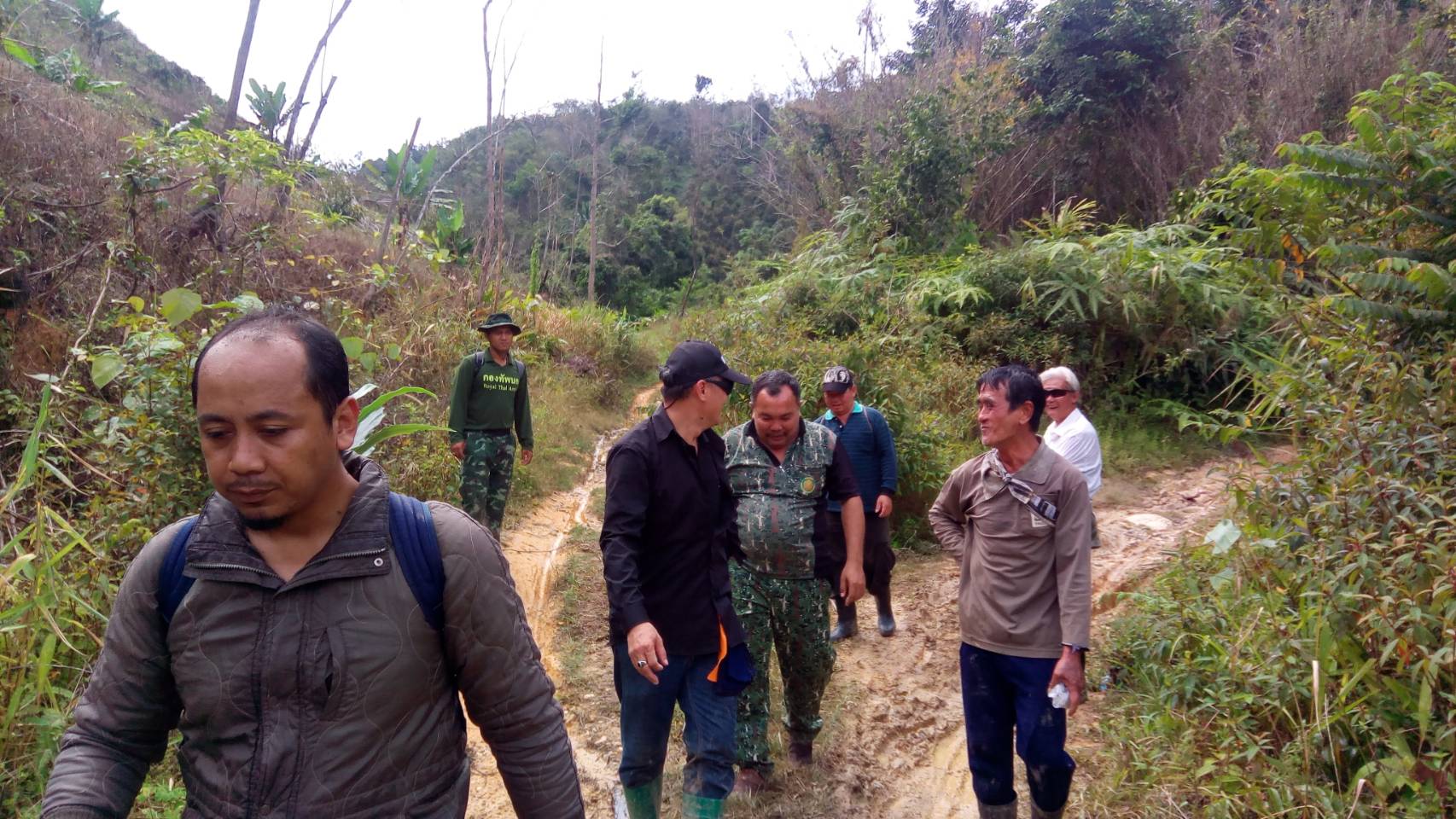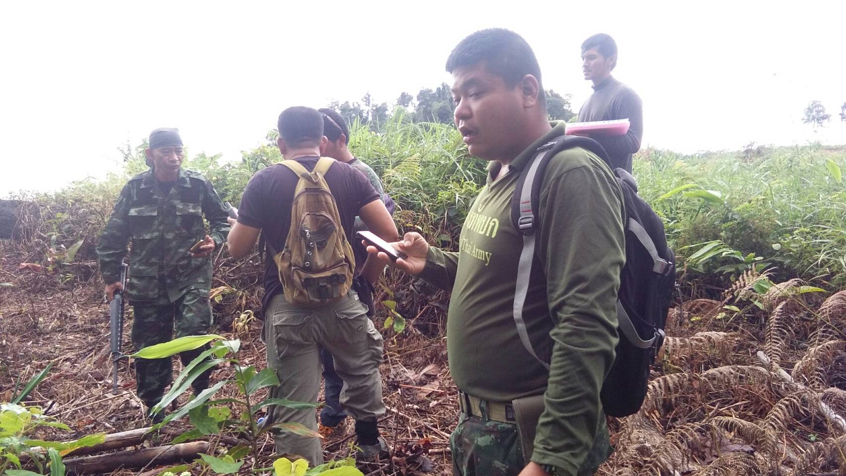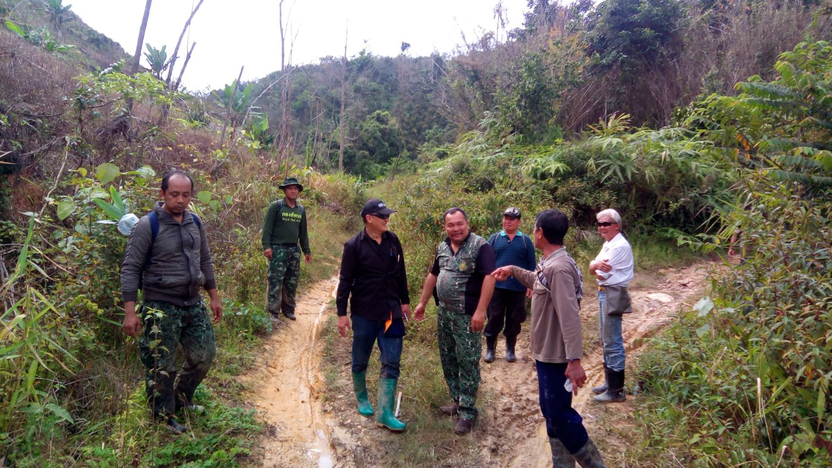 จ.ส.อ ทรงวุฒิ สุบรรณภาพ เจ้าหน้าที่ที่ดิน ผยย.มทบ๔๖ ร.ต มานพ หอมสุวรรณ กอ.รมน.จังหวัดยะลาพร้อมด้วยผู้ร่วมพัฒนาชาติไทย บ.ปิยมิตร๓ ร่วมกันออกตรวจสภาพป่า ในการที่กองทัพบกยื่นขอ ต่อใบอนุญาต ขอใช้ประโยชน์พื้นที่ป่าสงวนแห่งชาติ ป่าเบตง บ้านปิยมิตร ๒ต.ตาเนาะแมเราะ อ.เบตง จ.ยะลา ต่อไปอีก ๓๐ ปี