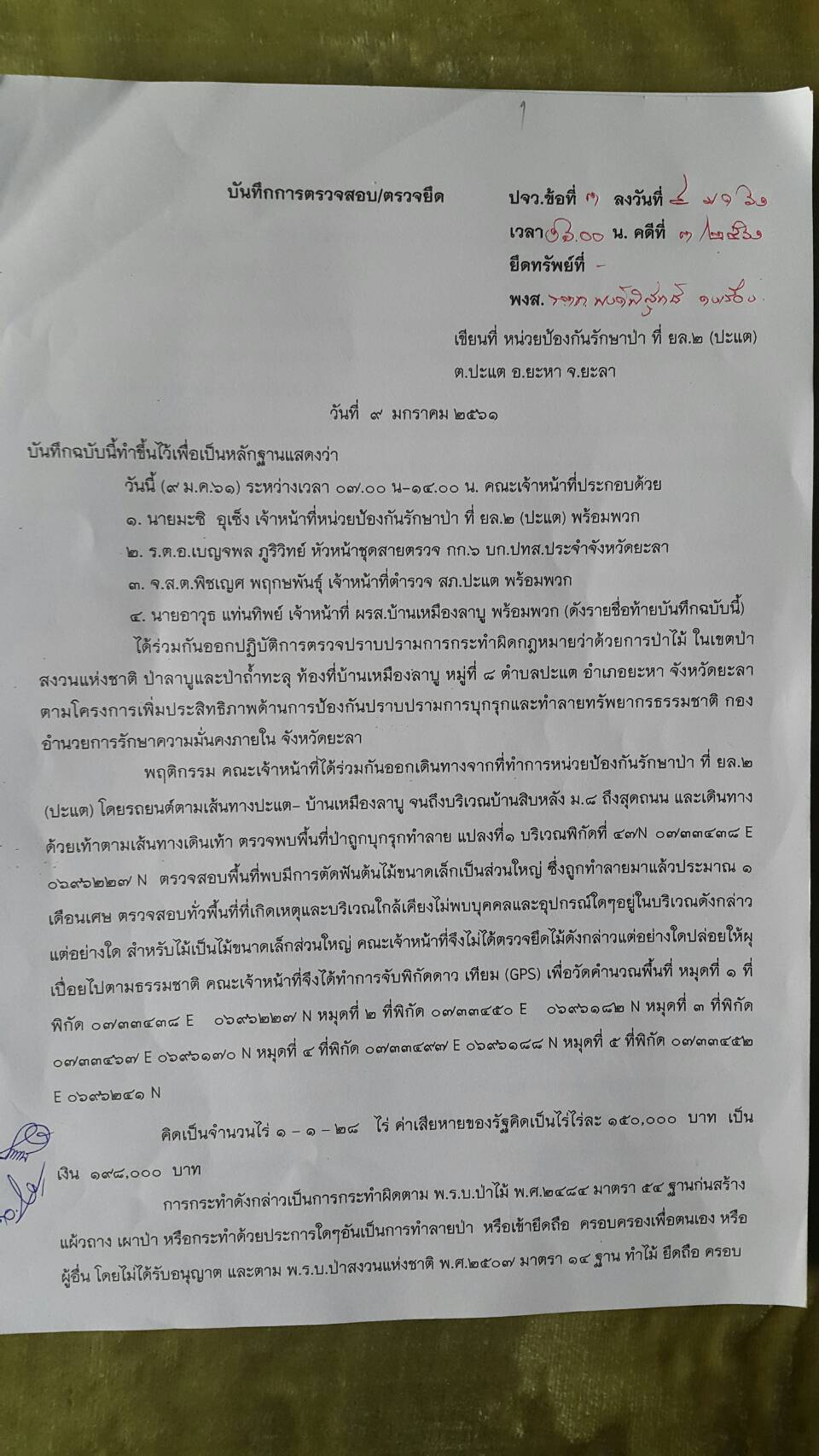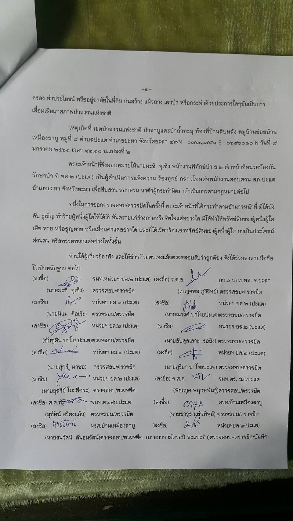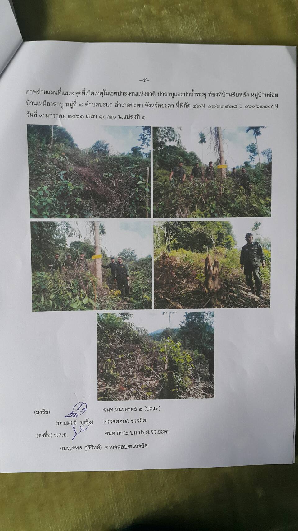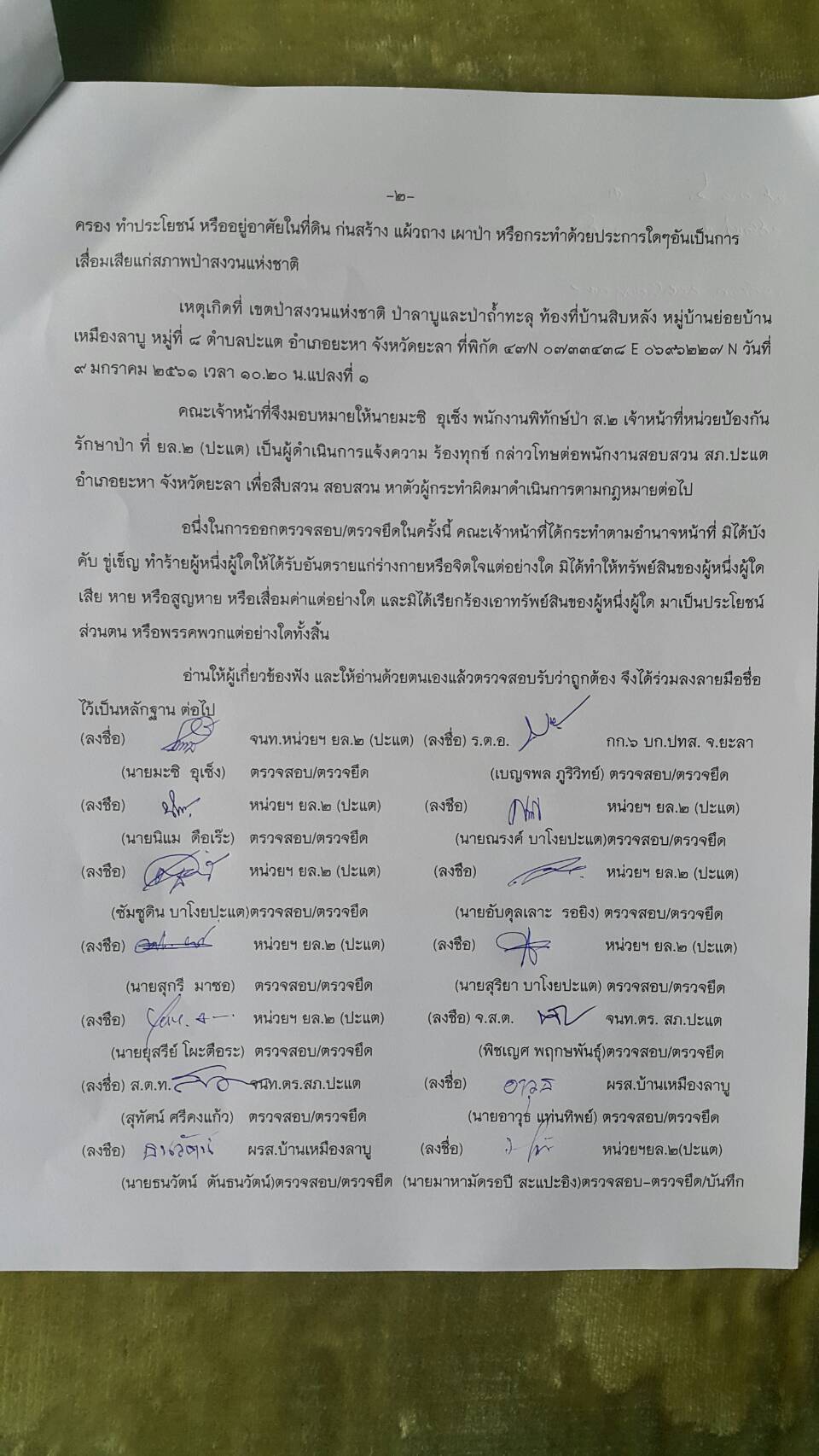 วันนี้ ๙ ม.ค.๖๑ คณะเจ้าหน้าที่หน่วยฯยล.๒(ปะแต)พร้อมด้วยเจ้าหน้าที่ สายตรวจฯ กก.๖ กก.ปทส.จ.ยะลา เจ้าหน้าที่ตำรวจ สภ.ปะแต และเจ้าหน้าที่ ผรส.บ้านเหมืองลาบู ได้ร่วมกันออกตรวจปราบปรามการกระทำผิดกฏหมายป่าไม้ตามโครงการเพิ่มประสิทธิภาพด้านการป้องกันปราบปรามการบุกรุกและทำลายทระพยากรธรรมชาติ กอ.รมน.จ.ยะลา ในเขตป่าสงวนแห่งชาติ ป่าลาบูและป่าถำ้ทะลุ ท้องที่บ้านสิบหลัง หมู่บ้านย่อยบ้านเหมืองลาบู ม.๘ ต.ปะแต อ.ยะหา จ.ยะลา ตรวจพบพื้นที่ป่าถูกบุกรุกทำลาย จำนวน ๒ จุด จุดที่ ๑ เนื้อที่ ๑-๑-๒๘ ไร่ ที่ พิกัด ๔๗N ๐๗๓๓๔๓๘ E ๐๖๙๖๒๔๑ N จุดที่ ๒ เนื้อที่ ๑๓-๐-๔๘ ไร่ ที่พิกัด ๔๗N ๐๗๓๑๗๕๖ E ๐๖๙๖๐๑๐ N ซึ่งหน่วยฯได้แจ้งความร้องทุกข์ต่อพนักงานสอบสวน สภ.ปะแต ไว้แล้ว จุดที่ ๑ ตาม ปจว.ข้อ ๓ เวลา ๑๖.๐๐น.คดีที่ ๓/๒๕๖๑ ลงวันที่ ๙ ม.ค.๖๑ และจุดที่ ๒ ตาม ปจว.ข้อที่ ๔ เวลา ๑๖.๓๐ น. คดีที่ ๔/๒๕๖๑ ลงวันที่ ๙ ม.ค.๖๑