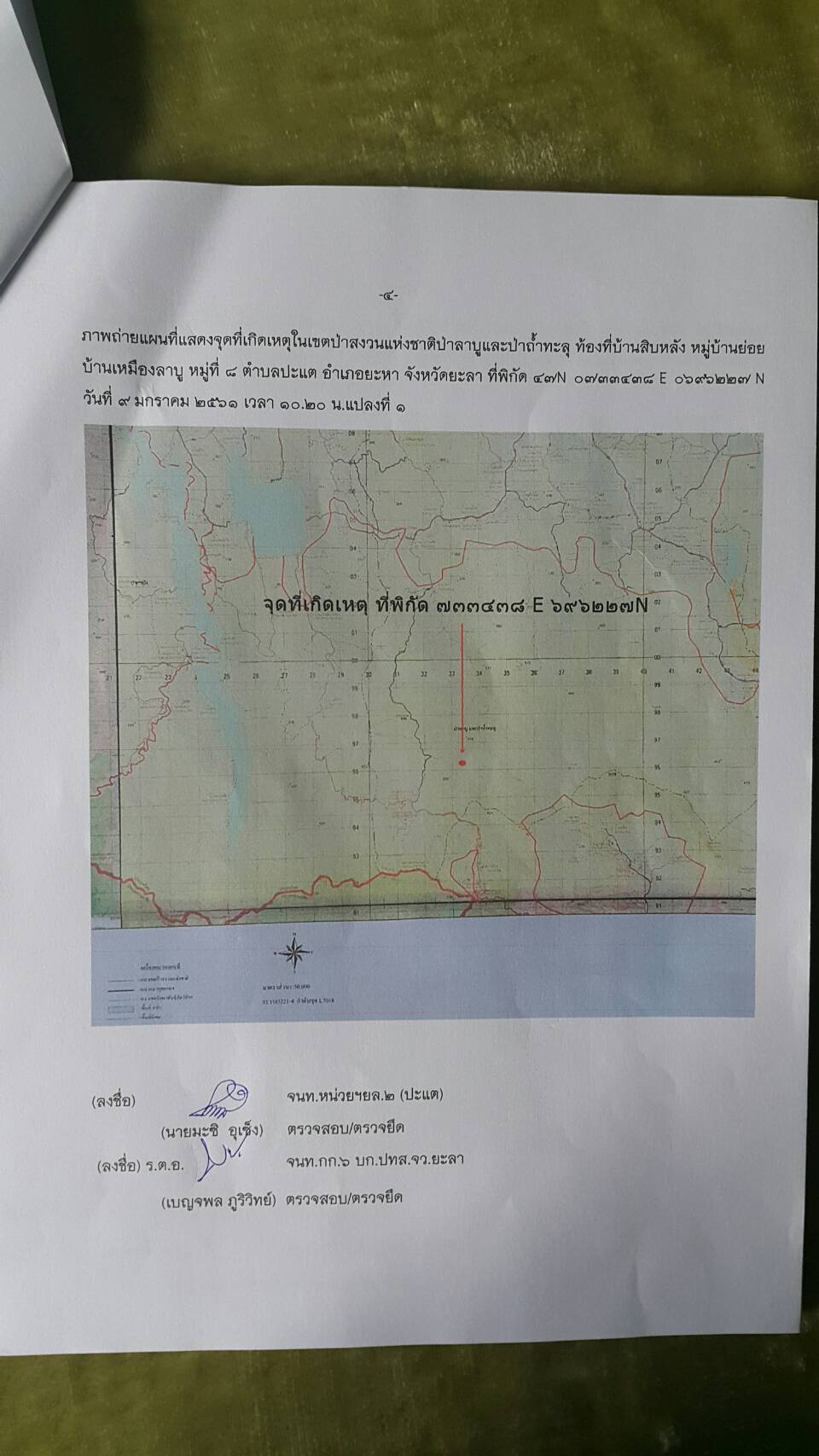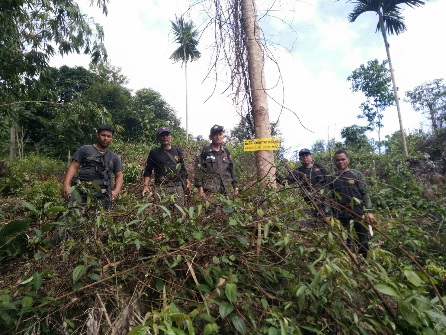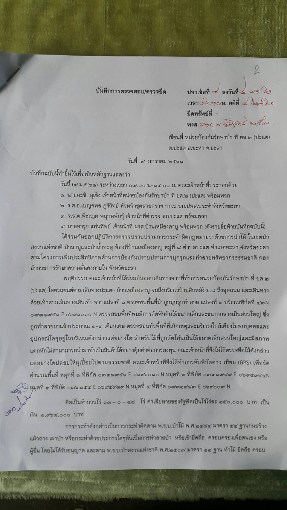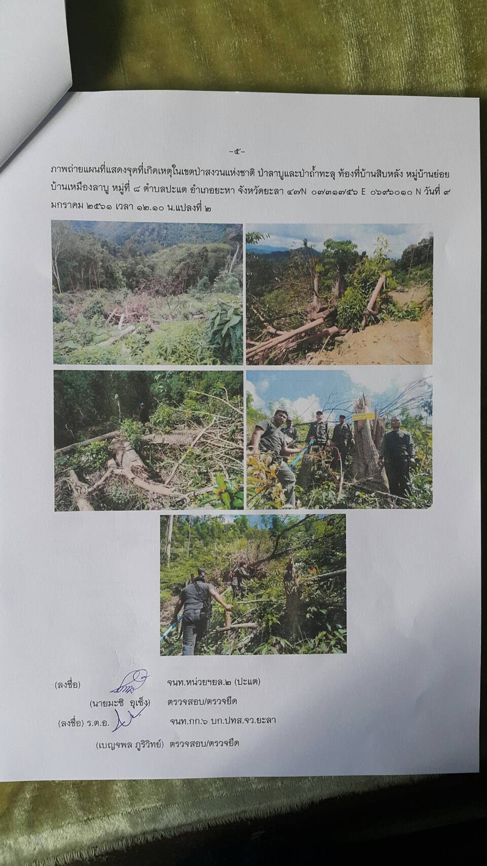 วันนี้ ๙ ม.ค.๖๑ คณะเจ้าหน้าที่หน่วยฯยล.๒(ปะแต)พร้อมด้วยเจ้าหน้าที่ สายตรวจฯ กก.๖ กก.ปทส.จ.ยะลา เจ้าหน้าที่ตำรวจ สภ.ปะแต และเจ้าหน้าที่ ผรส.บ้านเหมืองลาบู ได้ร่วมกันออกตรวจปราบปรามการกระทำผิดกฏหมายป่าไม้ตามโครงการเพิ่มประสิทธิภาพด้านการป้องกันปราบปรามการบุกรุกและทำลายทระพยากรธรรมชาติ กอ.รมน.จ.ยะลา ในเขตป่าสงวนแห่งชาติ ป่าลาบูและป่าถำ้ทะลุ ท้องที่บ้านสิบหลัง หมู่บ้านย่อยบ้านเหมืองลาบู ม.๘ ต.ปะแต อ.ยะหา จ.ยะลา ตรวจพบพื้นที่ป่าถูกบุกรุกทำลาย จำนวน ๒ จุด จุดที่ ๑ เนื้อที่ ๑-๑-๒๘ ไร่ ที่ พิกัด ๔๗N ๐๗๓๓๔๓๘ E ๐๖๙๖๒๔๑ N จุดที่ ๒ เนื้อที่ ๑๓-๐-๔๘ ไร่ ที่พิกัด ๔๗N ๐๗๓๑๗๕๖ E ๐๖๙๖๐๑๐ N ซึ่งหน่วยฯได้แจ้งความร้องทุกข์ต่อพนักงานสอบสวน สภ.ปะแต ไว้แล้ว จุดที่ ๑ ตาม ปจว.ข้อ ๓ เวลา ๑๖.๐๐น.คดีที่ ๓/๒๕๖๑ ลงวันที่ ๙ ม.ค.๖๑ และจุดที่ ๒ ตาม ปจว.ข้อที่ ๔ เวลา ๑๖.๓๐ น. คดีที่ ๔/๒๕๖๑ ลงวันที่ ๙ ม.ค.๖๑