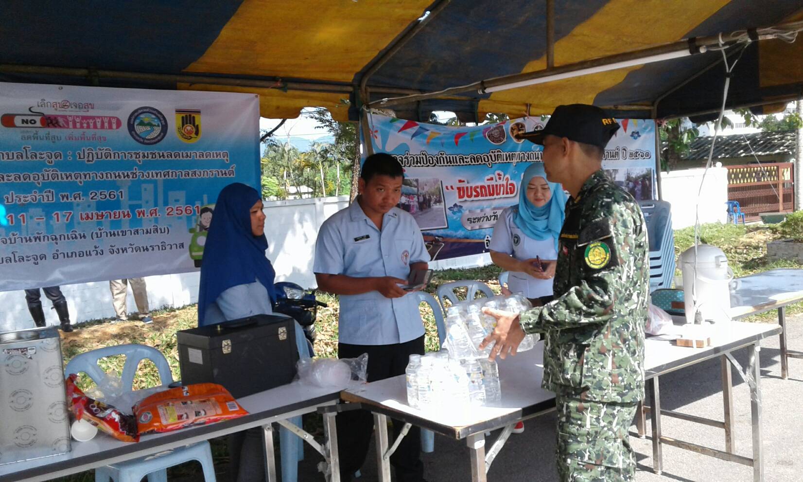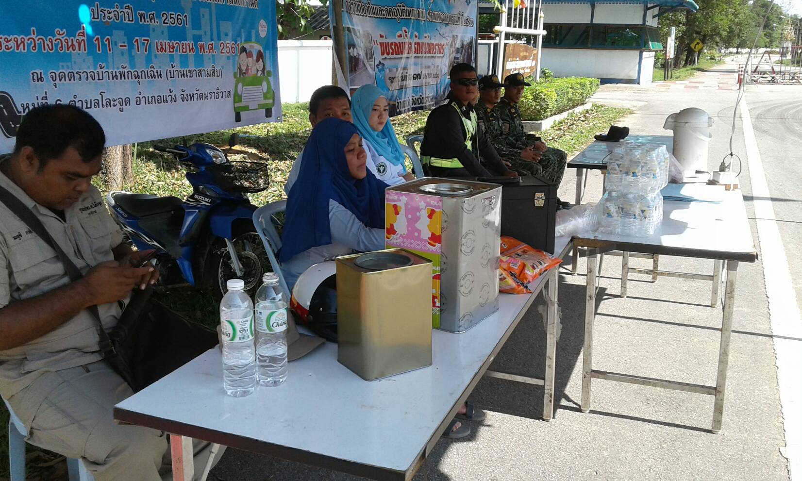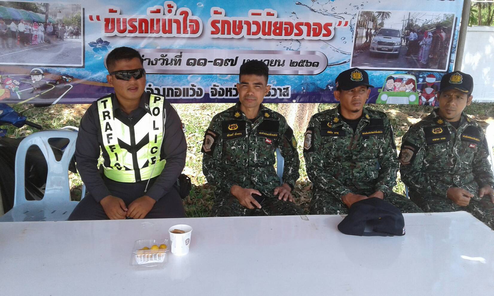 วันนี้ 13/04/61 เวลา 09.00 น. เป็นต้นไป จนท.หน่วยฯ นธ. 5(แว้ง-สุคิริน) เข้าร่วมอำนวยความสะดวกแก่ประชาชนประจำด่านตรวจ ช่วงเทศกาล สงกรานต์ 2561 “ขับรถมีน้ำใจ รักษาวินัยจราจร ระหว่างวันที่ 11-17 เมษายน 2561 ณ บริเวณจุดตรวจร่วมป้องกันและลดอุบัติเหตุทางถนน หน้าหน่วยเฉพาะกิจกรมทหารพรานที่ 11 ม. 9 ต. โละจูด อ. แว้ง จ. นราธิวา