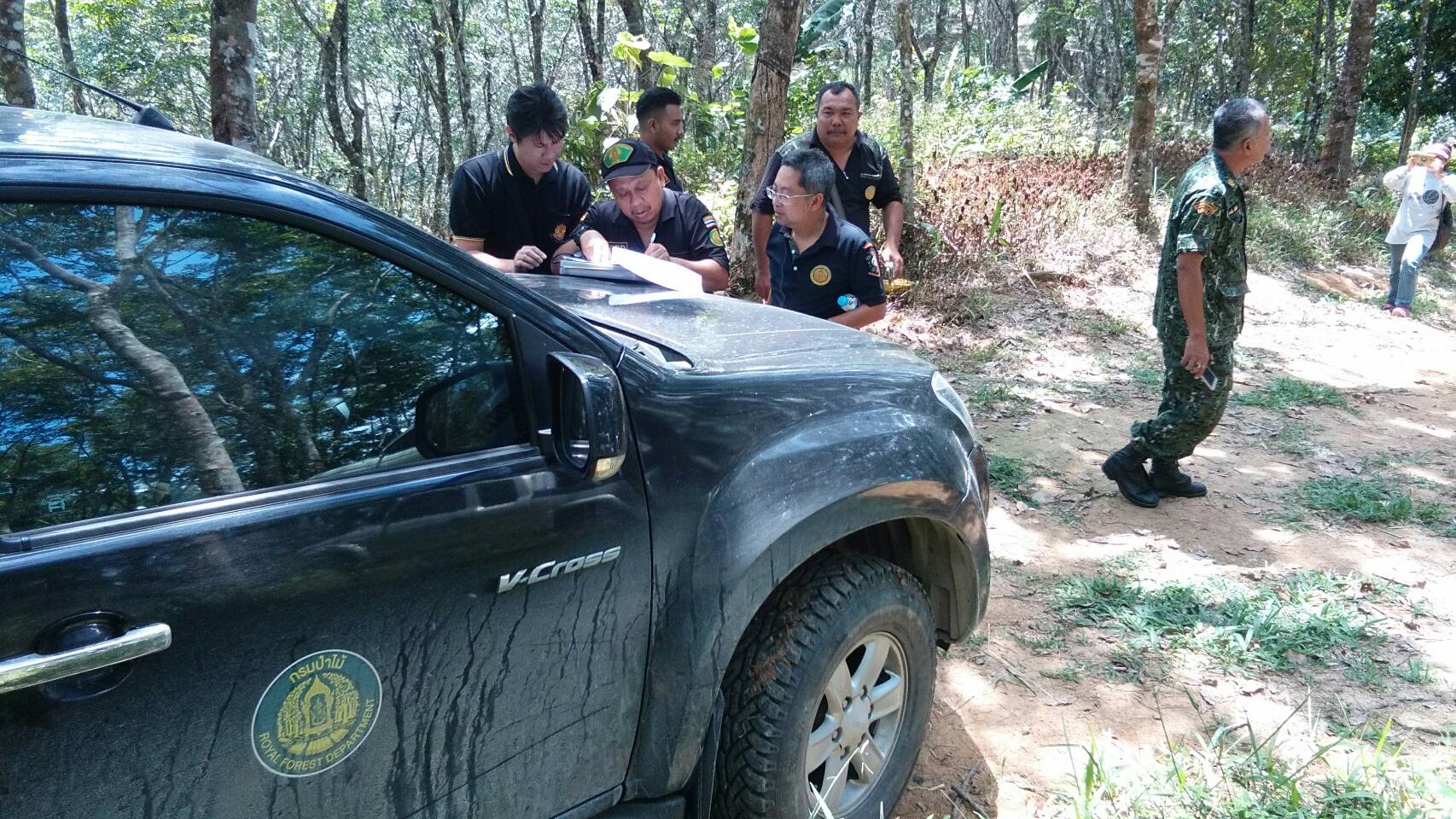 วันพุธที่ ๑๘ เมษายน ๒๕๖๑ หัวหน้าหน่วยป้องกันรักษาป่าที่ ยล.๔ (บ่อน้ำร้อน-จันทรัตน์)และเจ้าหน้าที่หน่วยป้องกันรักษาป่า พร้อมขณะกรรมการ สืบสวนข้อเท็จจริงจากกรมป่าไม้และเจ้าของสวน พื้นที่ หมู่๑๑ บ้านสามร้อยไร่ ต.อัยเยอร์เวง อ.เบตง จ.ยะลา