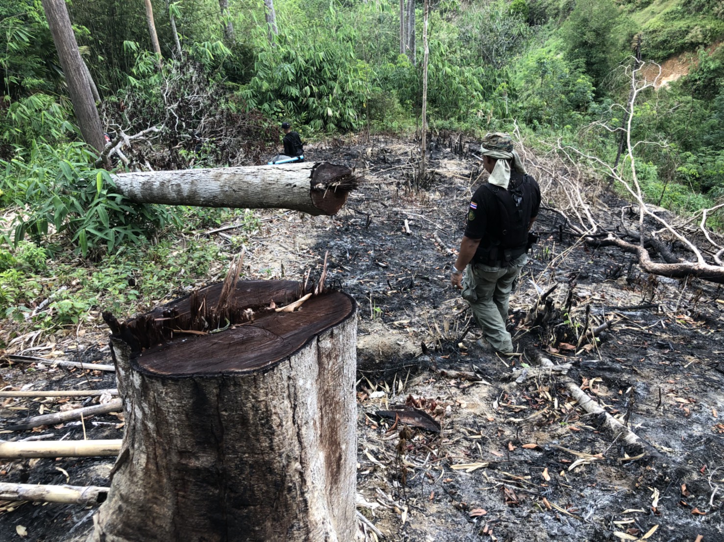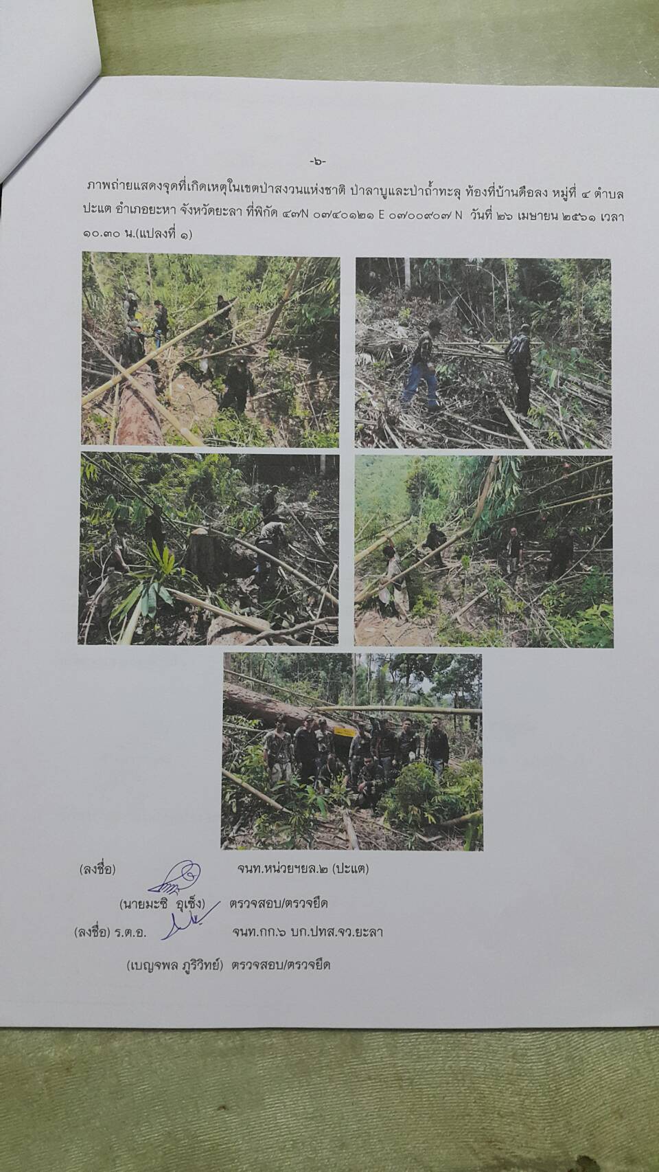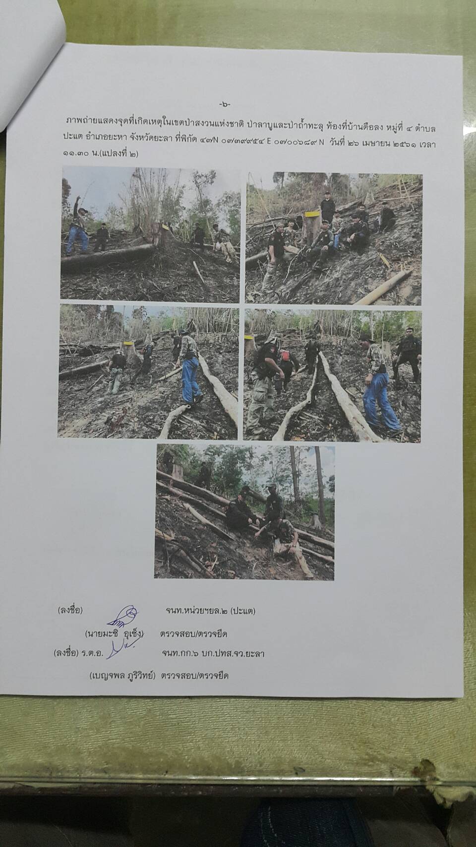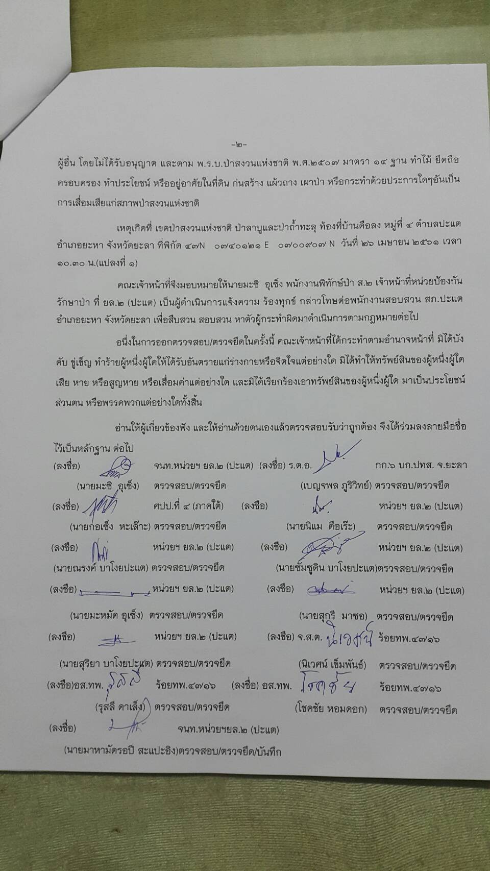 วันที่ ๒๖ เมษายน ๒๕๖๑ เวลา ๐๘.๓๐ น. สำนักจัดการทรัพยากรป่าไม้ที่ 13 สาขานราธิวาส โดยเจ้าหน้าที่หน่วยฯยล.๒(ปะแต) ร่วมกับเจ้า หน้าที่สายตรวจปราบปรามฯ กก.๖ บก.ปทส.จ.ยะลา,จนท.กอ.รมน.,จนท.ศปป.ที่ ๔(ภาคใต้) กรมป่าไม้และ จนท.อส.ทพ.ร้อย ร.๔๗๑๖ ร่วมกันออกตรวจปราบปรามการกระทำผิดกฏหมายว่าด้วยการป่าไม้ ตามผลการบินตรวจสอบสภาพป่า เมื่อวันที่ ๑๙ มี.ค. ๖๑ และตามโครงการ เพิ่มประสิทธิภาพด้านการป้องกันปราบปรามการบุกรุกและทำลายทรัพยากรธรรมชาติ กองอำนวยการรักษาความมั่นคงภายใน จังหวัดยะลา ในเขตพื้นที่ป่าสงวนแห่งชาติป่าลาบูและป่าถำทะลุ พบพื้นที่ป่าถูกบุกรุกทำลาย จำนวน ๒ จุด