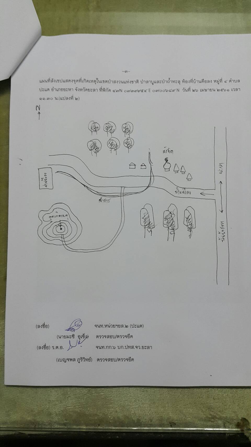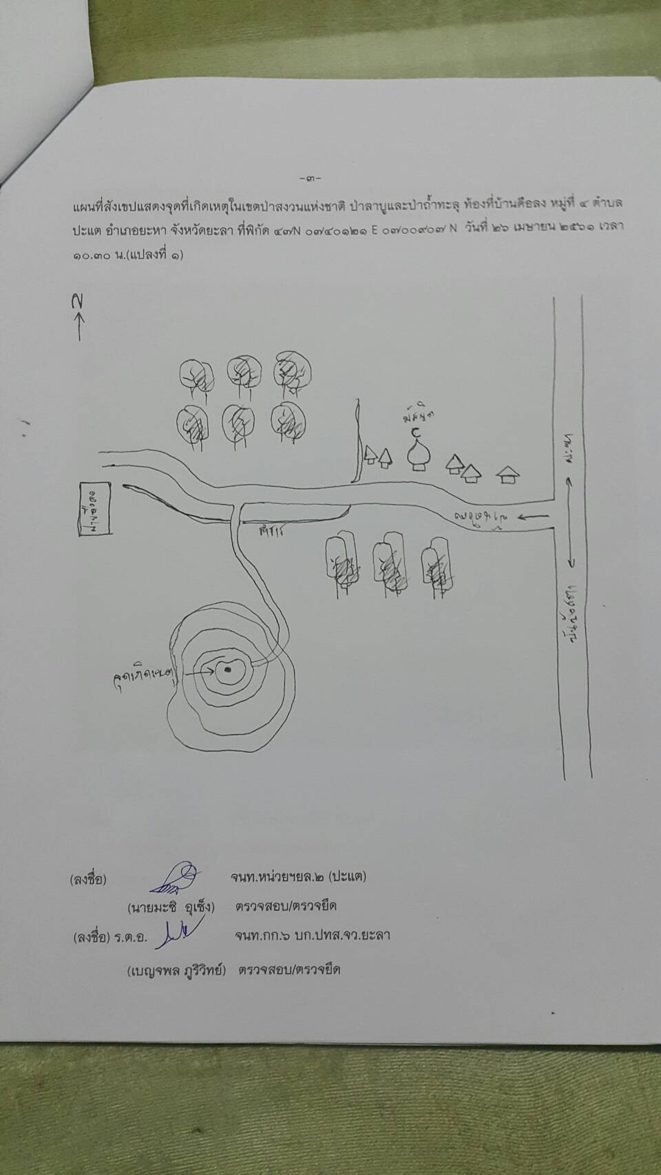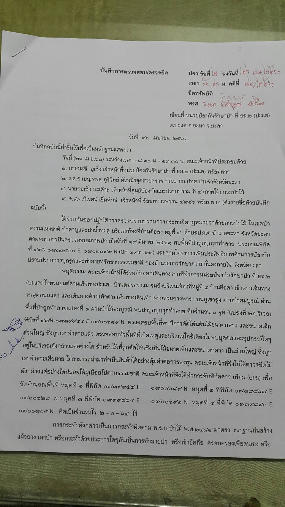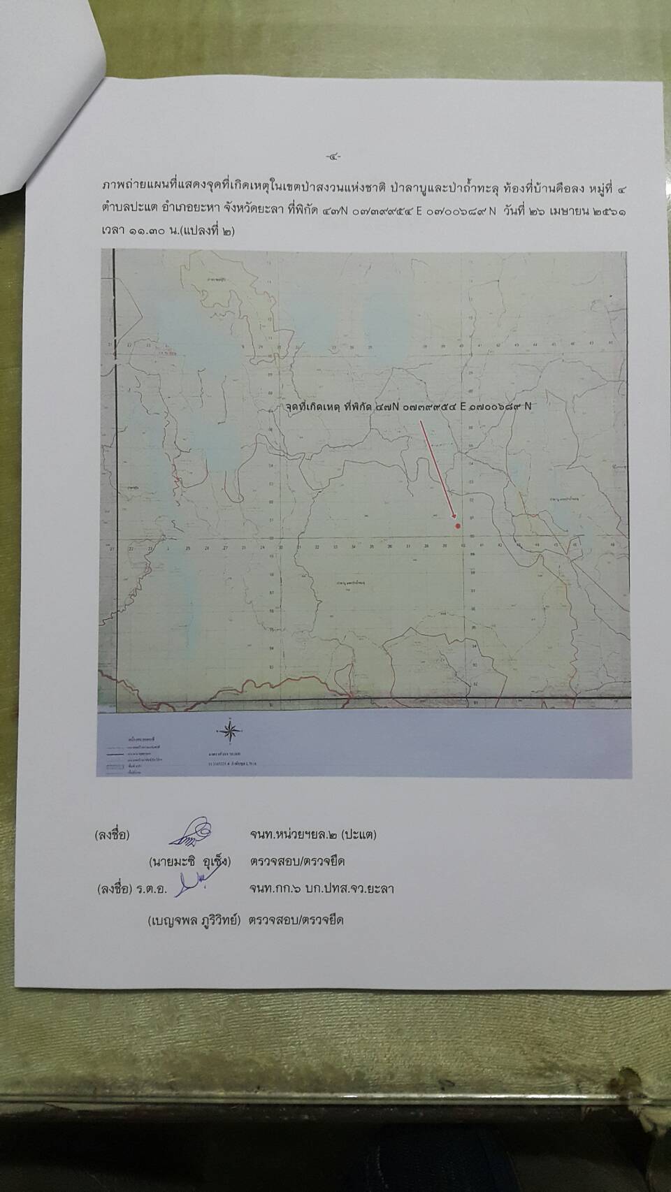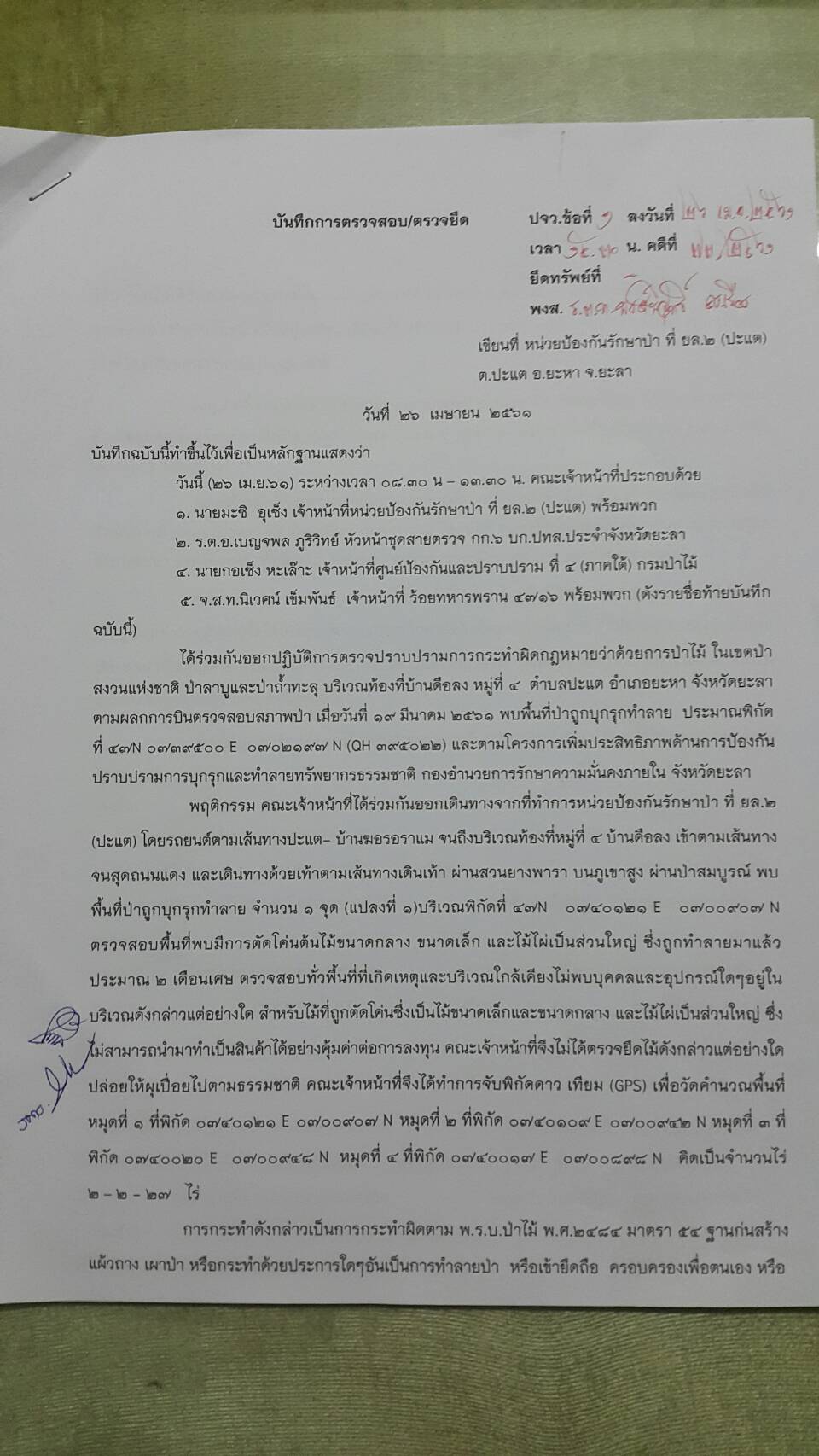 จุดที่ ๑ ที่พิกัด ๔๗ N ๐๗๔๐๑๒๑ E ๐๗๐๐๙๐๗ N เนื้อที่ ๒-๒-๒๗ ไร่ จุดที่ ๒ ที่พิกัด ๔๗ N ๐๗๓๙๙๕๔ E ๐๗๐๐๖๘๙ N เนื้อที่ ๒-๐-๖๔ ไร่ ท้องที่บ้านดือลง หมู่ที่ ๔ ต.ปะแต อ .ยะหา จ.ยะลา และหน่วยฯได้ดำเนินการแจ้งความร้องทุกข์ต่อพนักงานสอบสวน สภ.ปะแต ไว้แล้ว จุดที่ ๑ ตาม ปจว.ข้อที่ ๑ เวลา ๑๕.๓๐ น. คดีที่ ๗๓/๒๕๖๑ ลงวันที่ ๒๖ เมษายน ๒๕๖๑