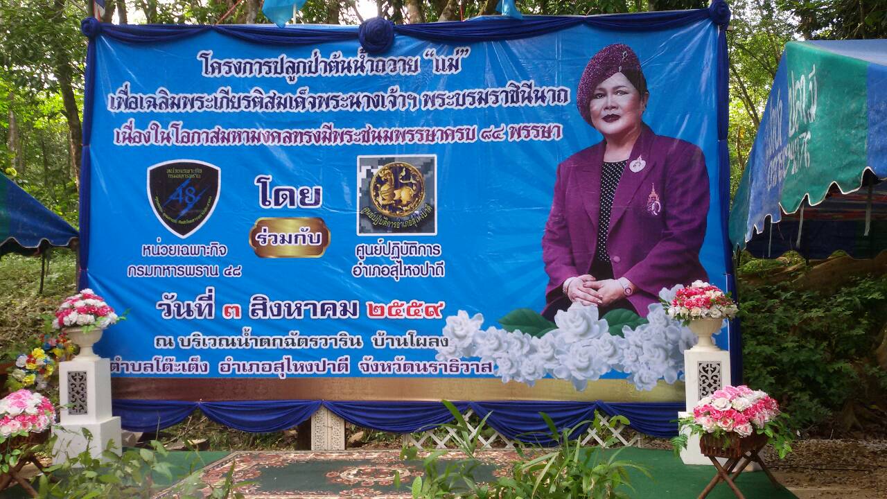 วันนี้ 3 ส.ค. 59 เวลา 9.30 น. หน่วยนธ.4 (สุไหงปาดี) ร่วมโครงการปลูกป่าต้นน้ำถวาย”แม่” เพื่อเฉลิมพระเกียรติสมเด็จพระนางเจ้าพระบรม ราชินีนาถ เนื่องในโอกาส มหามงคลทรงมีพระชนมพรรษาครบ ๘๔ พรรษา โดยมีปลัดอาวุโส อ.สุไหงปาดี เป็นประธาน ณ บริเวณน้ำตกฉัตวาริน บ้านโผลง ต.โต๊ะเด็ง อ.สุไหงปาดี จ.นราธิวาส