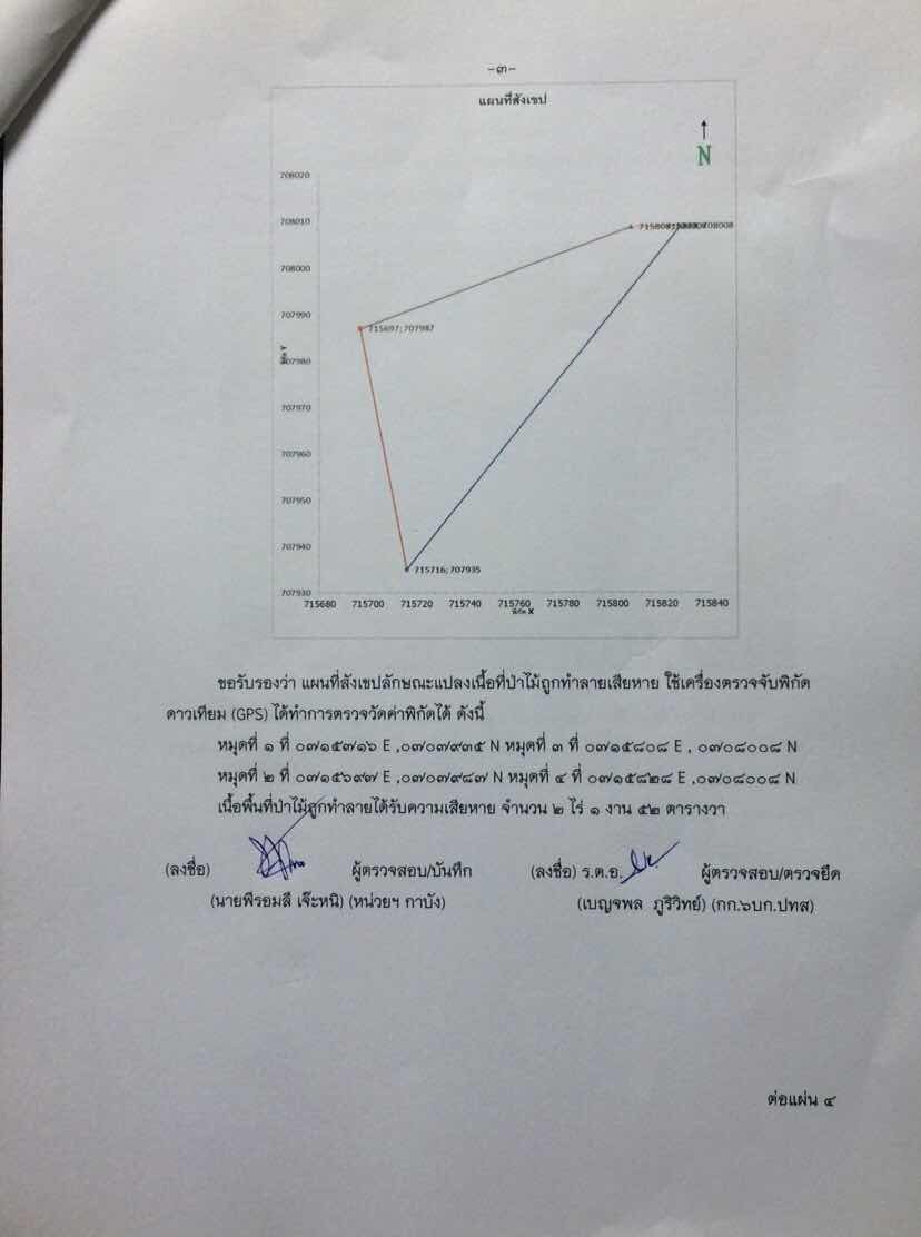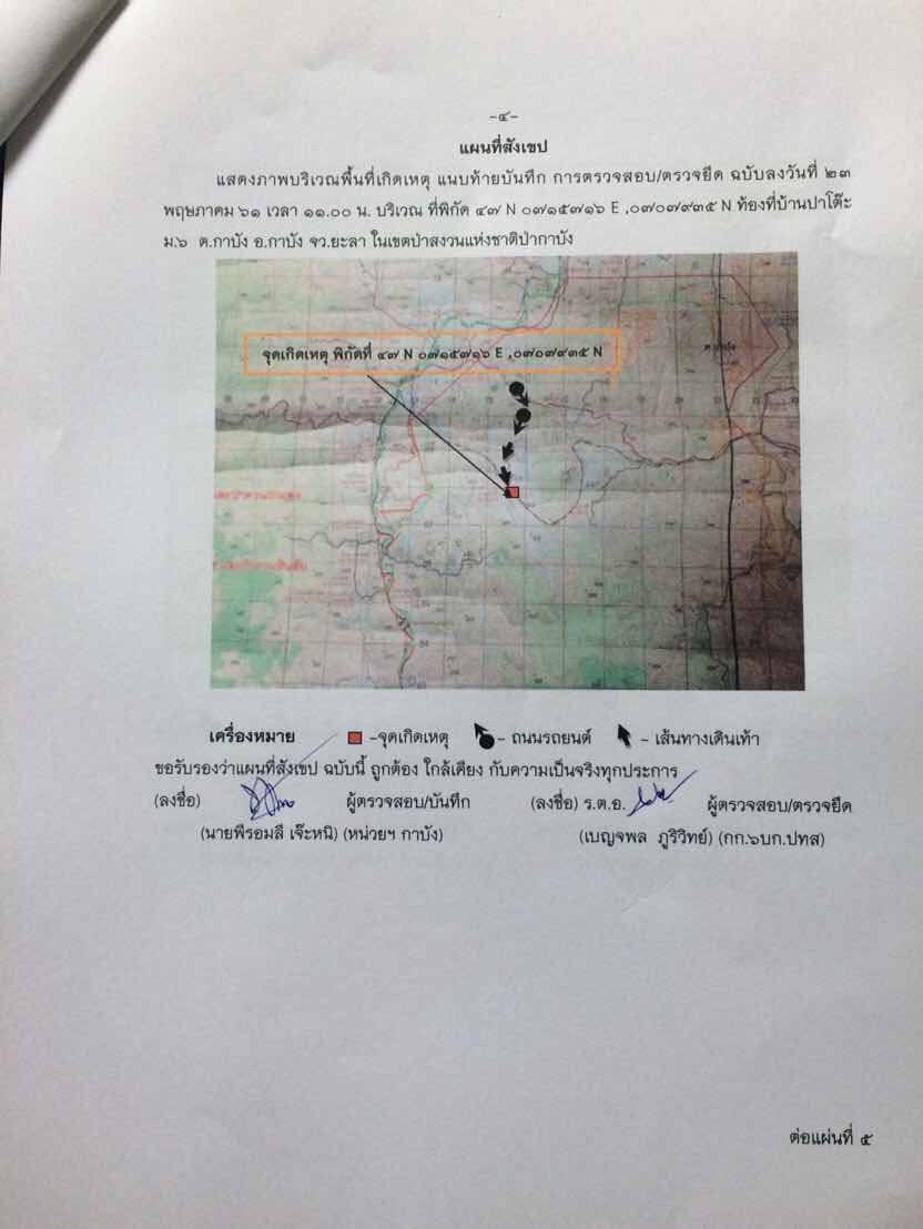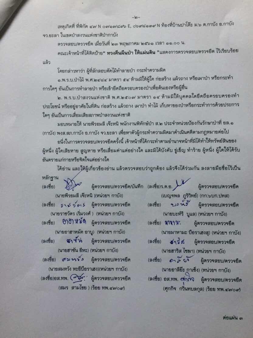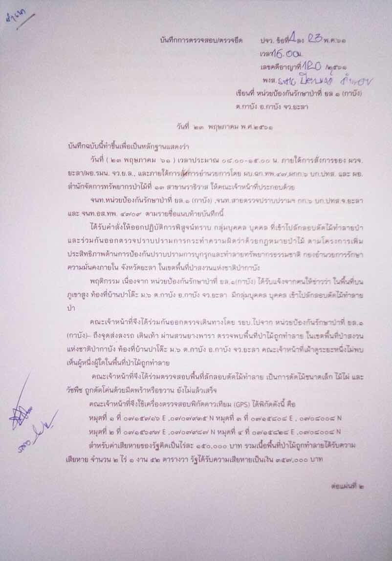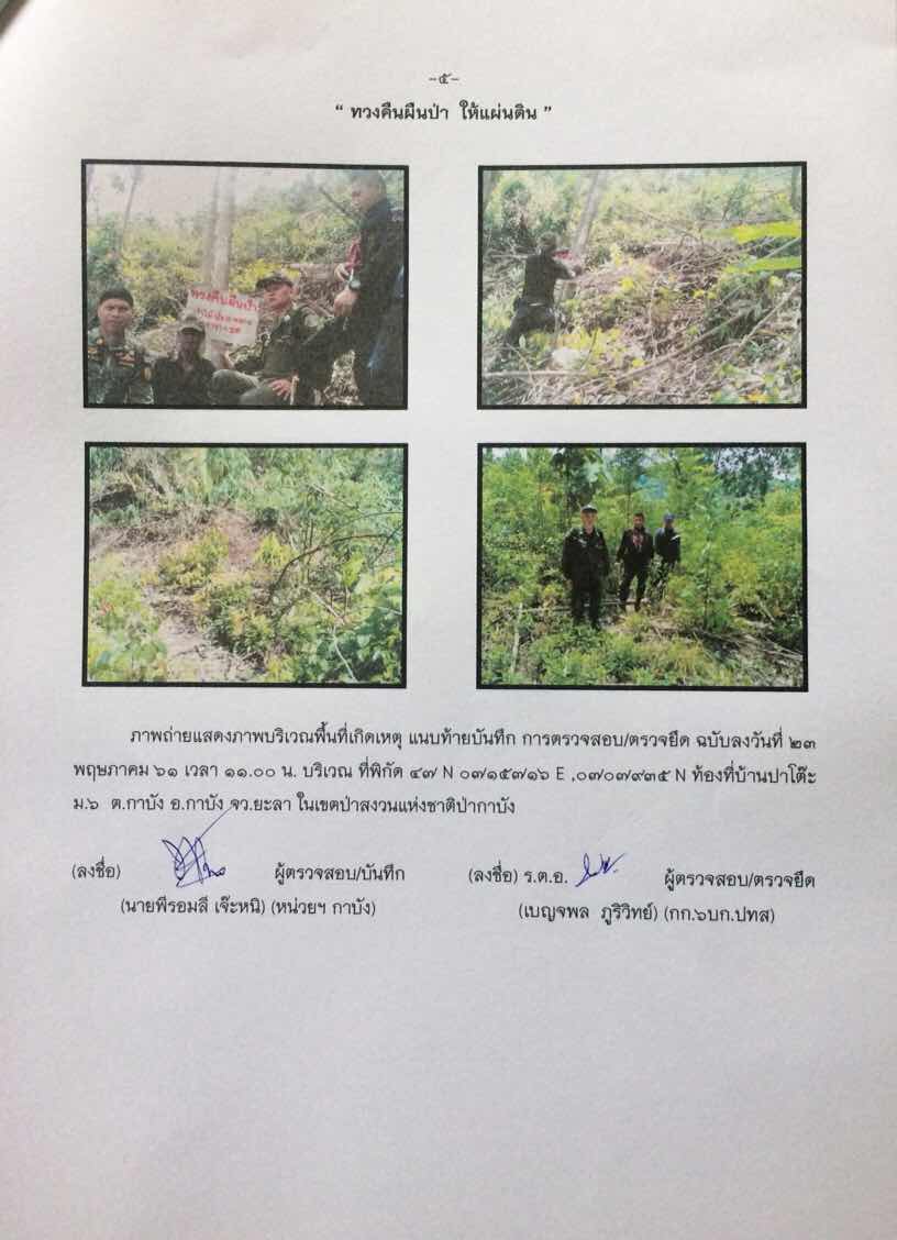 วันที่ 23 พฤษภาคม 2561 เวลา 08.00 น.-15.00 น. เจ้าหน้าที่หน่วยป้องกันรักษาป่าที่ ยล.1(กาบัง) พร้อมด้วย จนท.สายตรวจปราบปรามฯ กก.๖ บก.ปทส.จ.ยะลา และ จนท.อส.ทพ. 4709 ร่วมกันออกตรวจปราบปรามการกระทำผิดกฏหมายว่าด้วยการป่าไม้ ในเขตพื้นที่ป่าสงวนแห่งชาติป่ากาบัง ท้องที่บ้านปาโต๊ะ ม.6 ต.กาบัง อ.กาบัง จ.ยะลา ตรวจพบพื้นที่ป่าถูกบุกรุกแผ้วถาง จำนวน ๑ จุด พิกัดที่ 47N 0717896 E, 0698139 N จำนวนพื้นที่ประมาณ 2-1-52 ไร่ ซึ่งหน่วยฯ ได้แจ้งความร้องทุกข์กล่าวโทษต่อพนักงานสอบสวน สถ.กาบัง ตาม ปจว.ข้อที่ 4 เวลา 16.00 น.คดีที่ 120/2561 ลงวันที่ 23 พฤษภาคม 2561