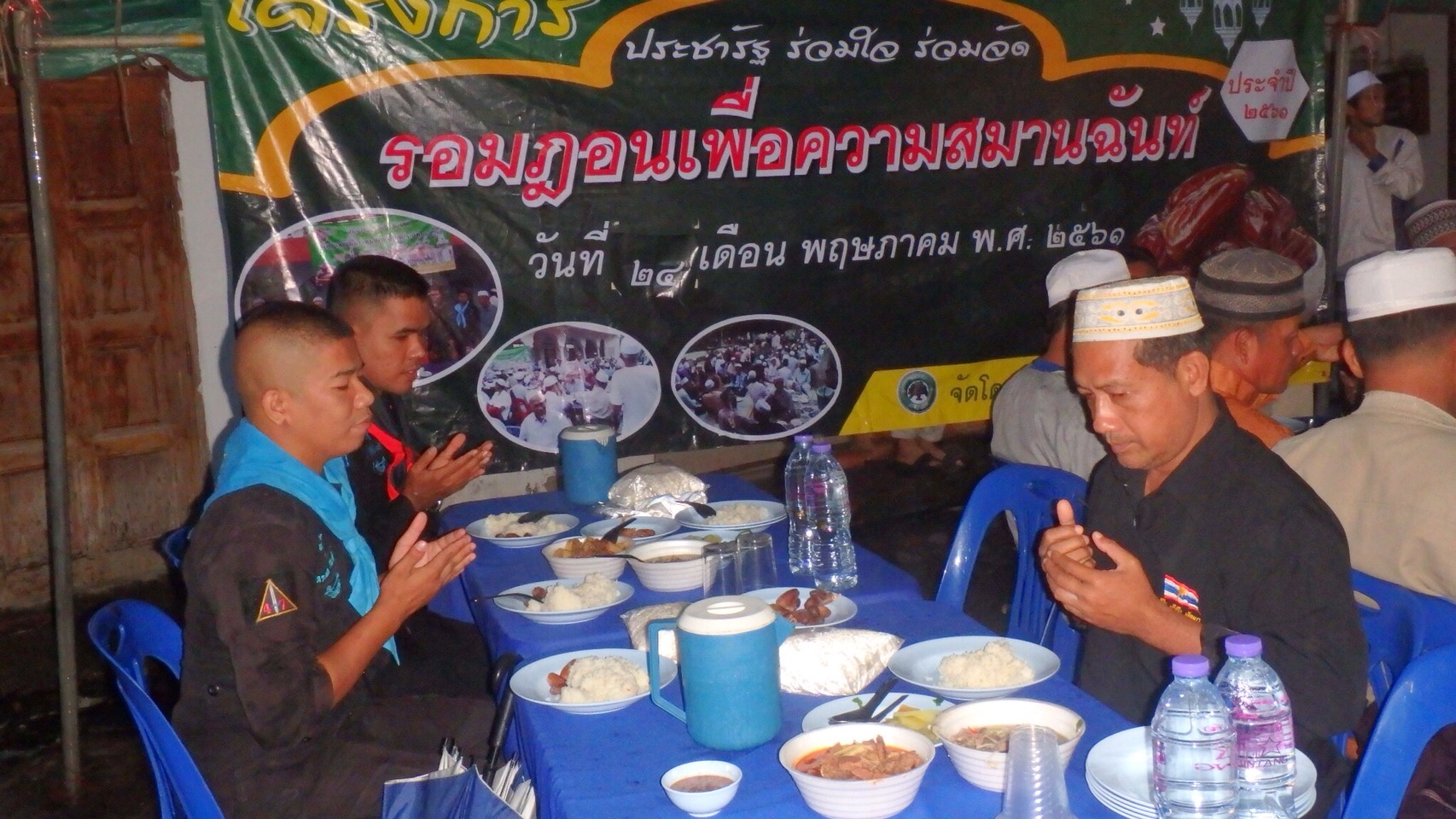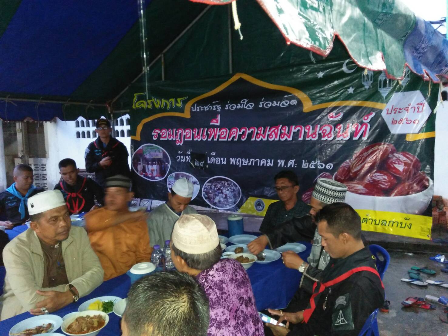 วันพฤหัสบดี ที่ ๒๔ พฤษภาคม ๒๕๖๑ เวลา ๑๘.๐๐ น. เจ้าหน้าที่หน่วยป้องกันรักษาป่าที่ ยล.๑(กาบัง) ร่วมละศีลอดประชารัฐร่วมใจ รอมฏอนเพื่อความสมานฉันท์ อบต.กาบัง กับพี่น้องมุสลิมพร้อมพบปะ พูดคุย เพื่อเป็นการสร้างความสัมพันธ์อันดีระหว่างพี่น้องในพื้นที่ โดยมี นายมนูญ พรหมน้อย นายอำเภอกาบัง/ผอ.ศปก.อ.กาบัง เป็นประธาน นายกอบต.กาบัง ผบ.ร้อย.ทพ.๔๗๐๑ ผู้ใหญ่บ้าน โต๊ะอีหม่าม คอเต็บ บิหลั่น กรรมการมัสยิด พี่น้องประชาชนใ้นพื้นที่ ให้การตอนรับ ณ มัสยิดจอปียอ หมู่ที่ ๑ ตำบลกาบัง อำเภอกาบัง จังหวัดยะลา