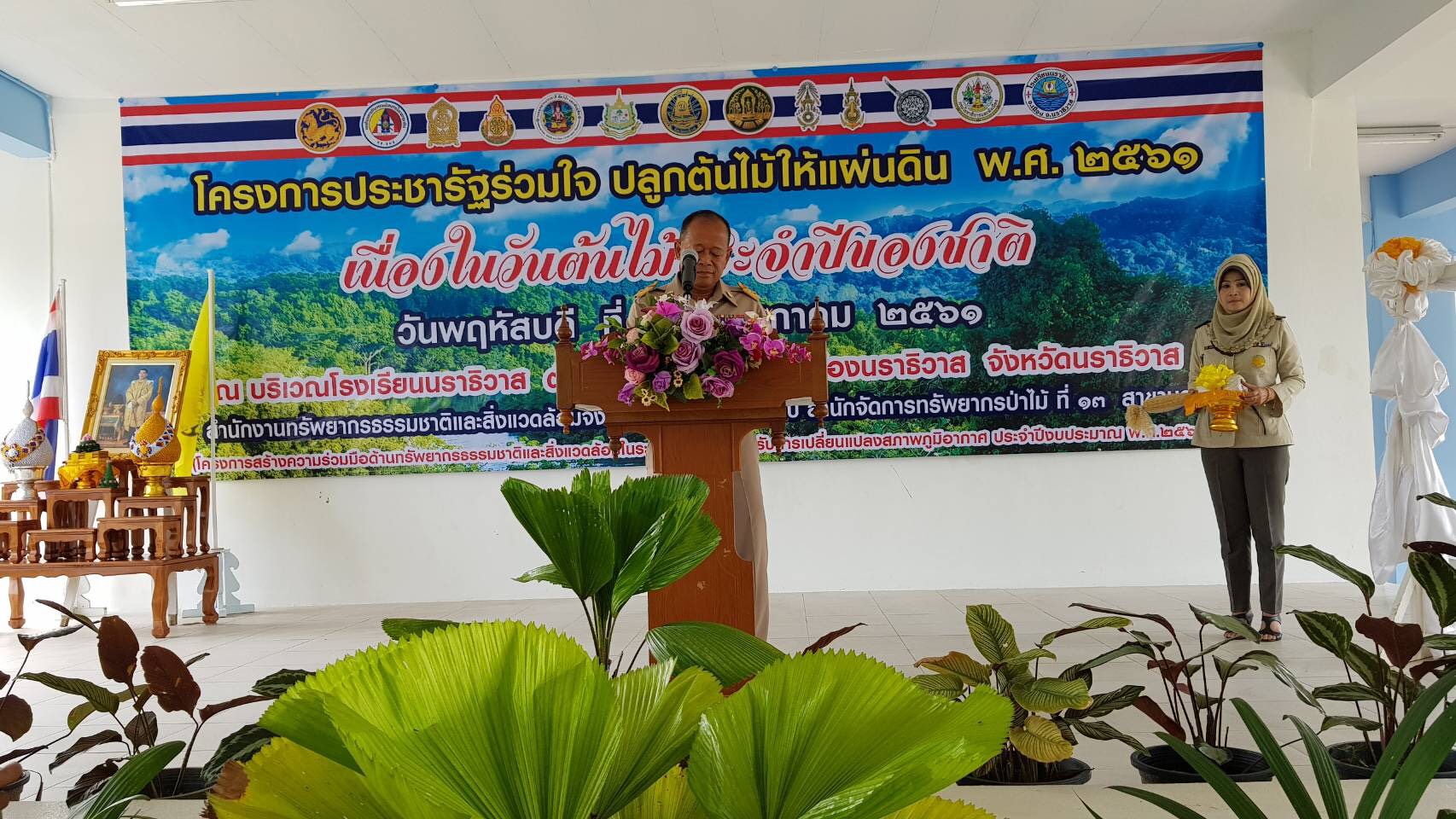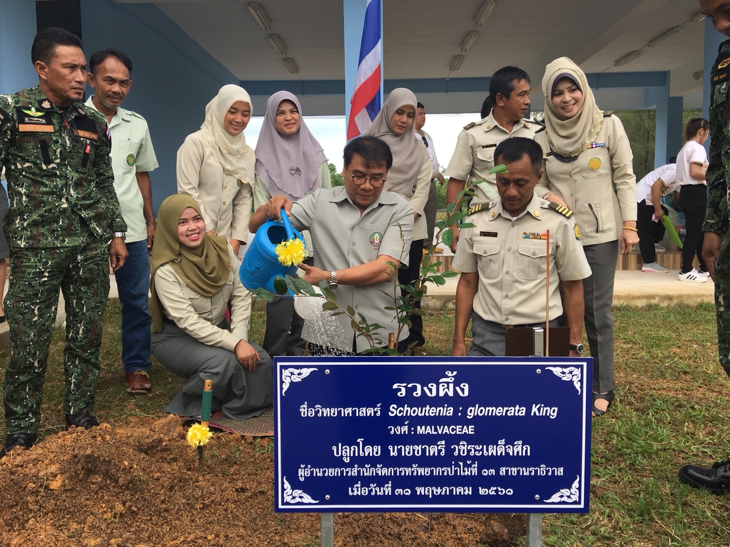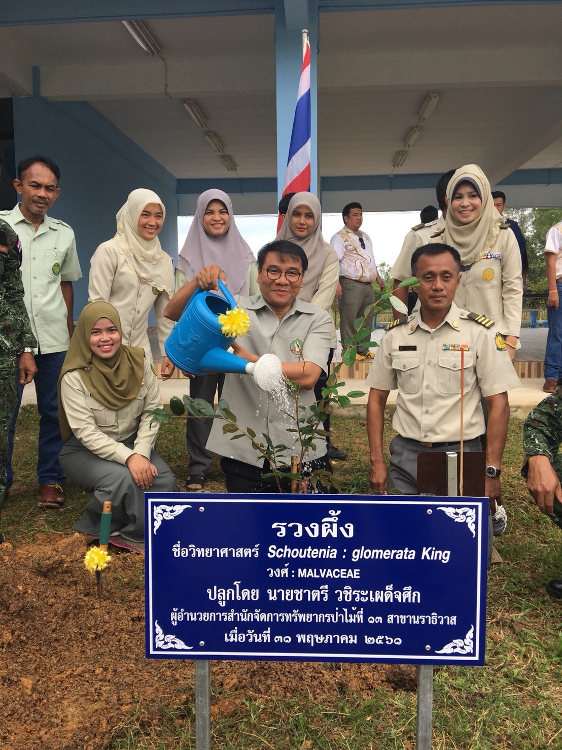 วันพฤหัสบดี ที่ 31 พฤษภาคม 2561 สจป.ที่ 13 สาขานราธิวาส โดยผู้อำนวยการสำนักจัดการทรัพยากรป่าไม้ที่ 13 สาขานราธิวาส (นายชาตรี วชิระเผด็จศึก) พร้อมด้วยข้าราชการ ลูกจ้างประจำ และพนักงานราชการในสังกัดได้ร่วมกับสำนักงานทรัพยากรธรรมชาติและสิ่งแวดล้อมจังหวัดนนราธิวาส จัดโครงการประชารัฐร่วมใจ ปลูกต้นไม้ให้แผ่นดิน ปี พ.ศ.2561 และวันต้นไม้ประจำปีของชาติ พ.ศ. 2561 ณ บริเวณโรงเรียนนราธิวาส ตำบลโคกเคียนอำเภอเมืองนราธิวาส จังหวัดนราธิวาส โดยมีท่านผู้ว่าราชการจังหวัดนราธิวาส (นายสุรพร พร้อมมูล) เป็นประธานในพิธี หัวหน้าส่วนราชการทุกภาคส่วน ,ผู้นำท้องที่ ,นักเรียน, นักศึกษา และประชาชน มีผู้เข้าร่วมกิจกรรม 500 คน เนื้อที่ปลูก 9 ไร่ จำนวนกล้าไม้ 900 ต้น ประกอบด้วย ต้นรวงผึ้ง ตะเคียนชันตาแมว พะยอม กฤษณา กันเกรา หว้า และต้นราชพฤกษ์