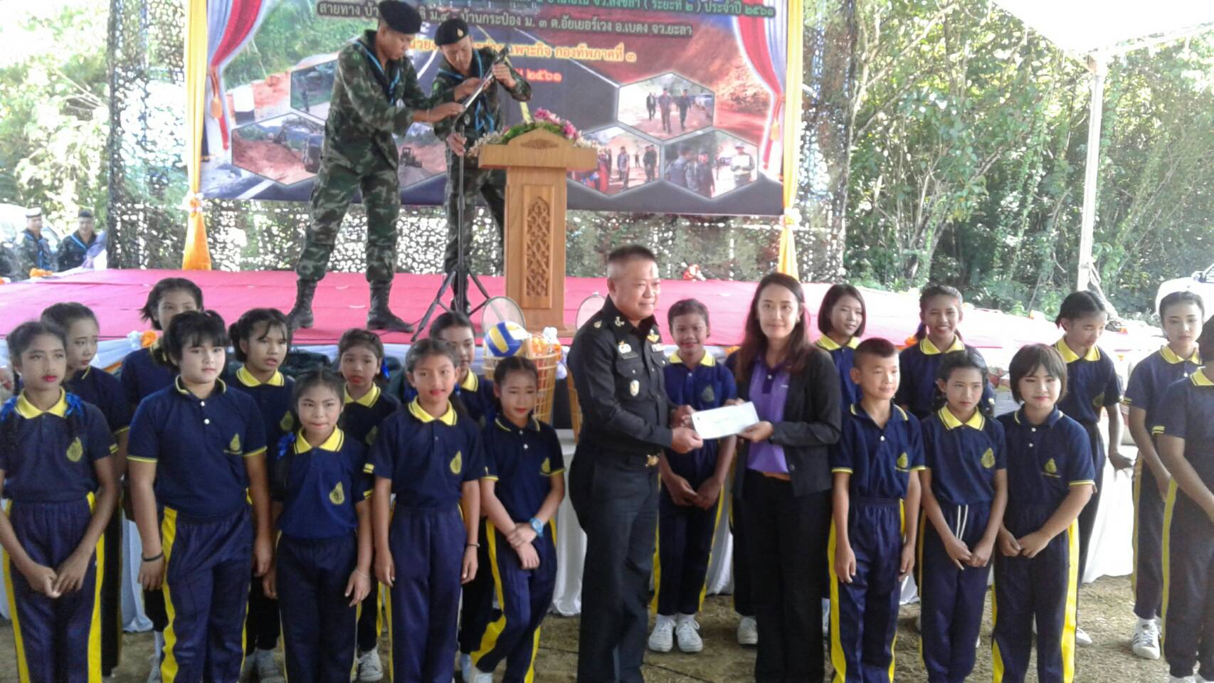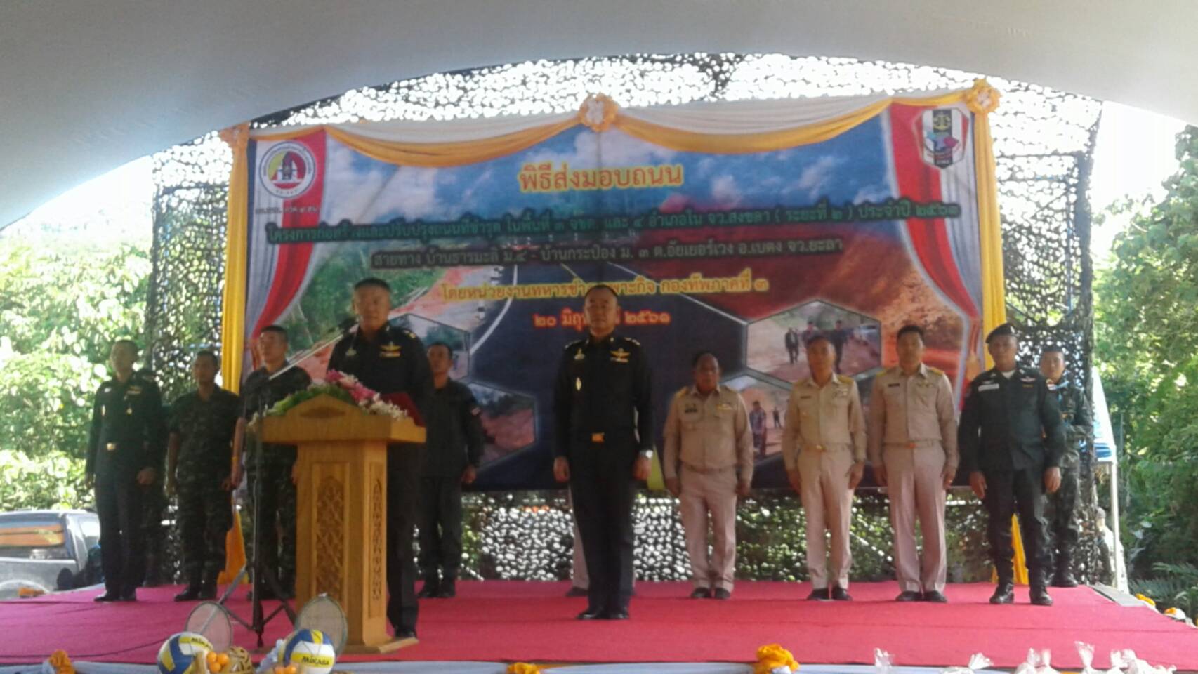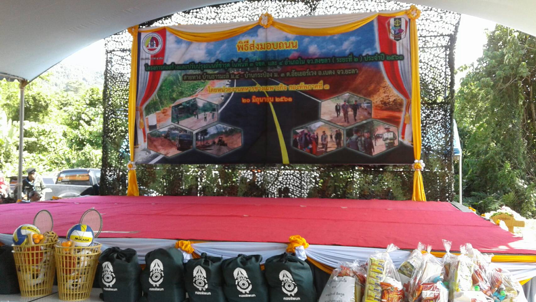 วันพุธที่ 20 มิถุนายน ๒๕๖๑ เวลา ๐9.0๐ น. สจป.ที่ 13 สาขานราธิวาส โดยเจ้าหน้าที่หน่วยป้องกันรักษาป่าที่ ยล.4 (บ่อน้ำร้อน-จันทรัตน์) ร่วมกับ หัวหน้าส่วนราชการ,รัฐวิสาหกิจ,สถานศึกษา,องค์การบริหารส่วนตำบล และกำนัน ผู้ใหญ่บ้านร่วมกิจกรรมอำเภอยิ้ม และพิธีส่งมอบถนนโครงการก่อสร้างและปรับปรุงถนนที่ชำรุดในพื้นที่ ๓ จชต.และ ๔ อำเภอใน จว.สงขลา(ระยะที่ ๒)ประจำปี ๒๕๖๑ สายทางบ้านธารมะลิ ม.๔ ต.อัยเยอร์เวง อ.เบตง จ.ยะลา โดยหน่วยงานทหารช่างเฉพาะกิจกองทัพภาคที่ ๓ โดย พลตรี ภาณุวัฒน์ เหนียวแน่น เป็นประธารในพิธี