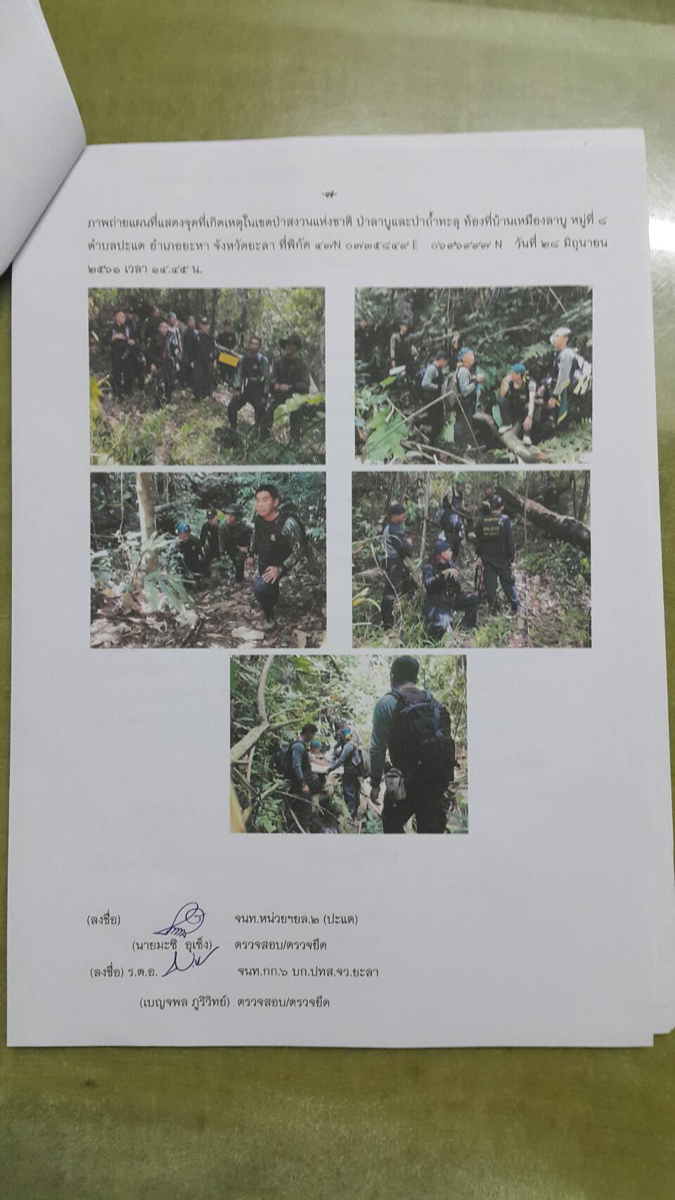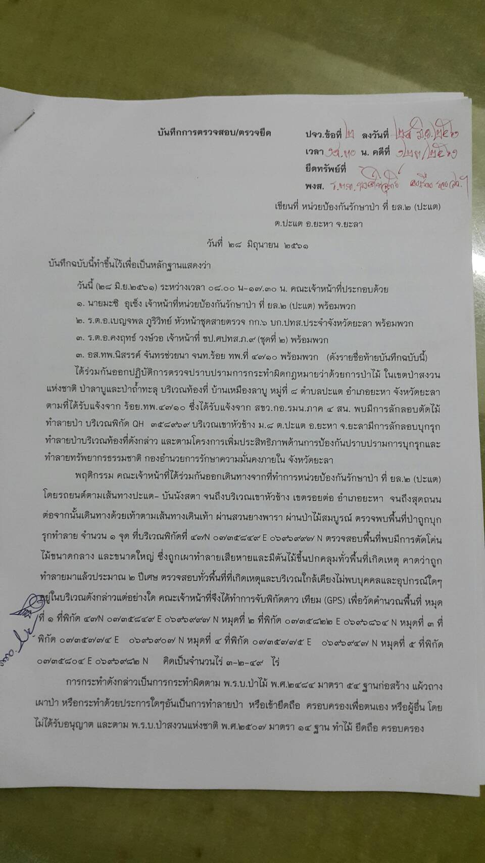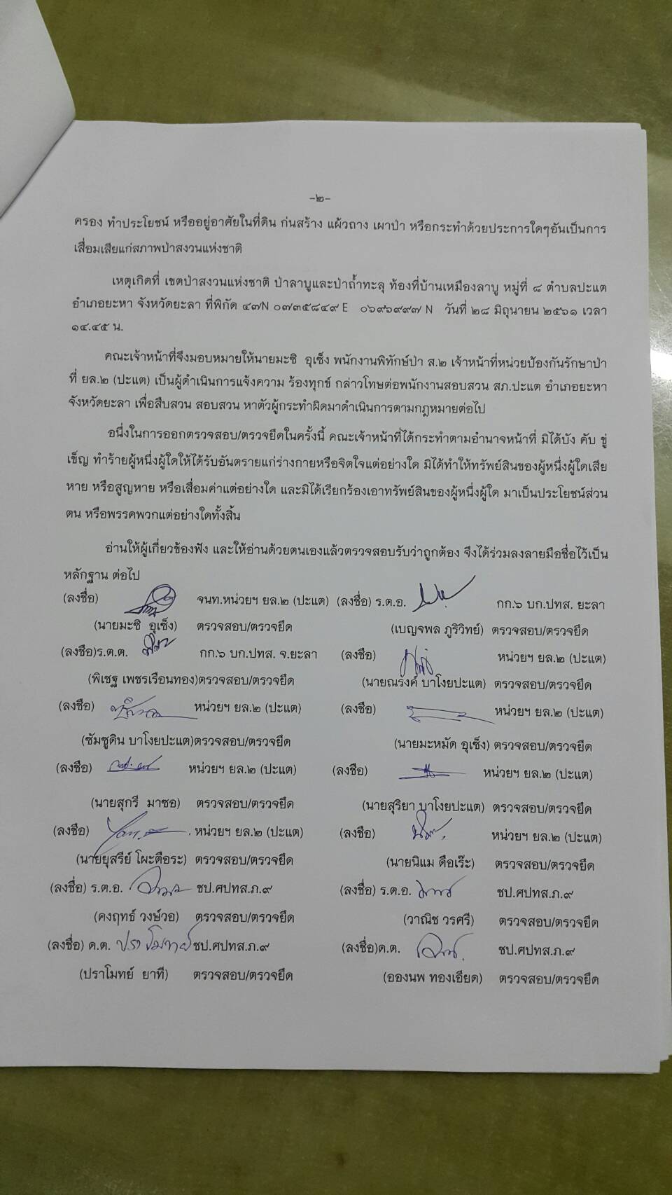 วันพฤหัสบดีที่ 28 มิถุนายน 2561 เวลา 08.๓๐ น. สจป.ที่ 13 สาขานราธิวาส โดยเจ้าหน้าที่หน่วยป้องกันรักษาป่าที่ยล.2 (ปะแต) พร้อมด้วย จนท.สายตรวจปราบปรามฯ กก.๖ บก.ปทส.จ.ยะลา, จนท.ชป.ศปทส.ภ.๙ (ชุดที่ ๒) และ เจ้าหน้าที่ร้อย ทหารพราน ๔๗๑๐ ร่วมกันออกตรวจปราบปรามการกระทำผิดกฏหมายว่าด้วยการป่าไม้ ตามที่ได้รับแจ้งจากร้อย ทพ ๔๗๑๐ ซึ่งได้รับแจ้งจาก สขว.กอ.รมน.ภาค ๔ สน พบมีการลักลอบตัดไม้ทำลายป่าบริเวณพิกัด QH ๓๕๘๙๖๙ บริเวณเขาหัวช้าง ม.๘ บ้านเหมืองลาบู ต.ปะแต อ.ยะหา จ.ยะลา และตามโครงการเพิ่มประสิทธิภาพด้านการป้องกันปราบปรามการบุกรุกและทำลายทรัพยากรธรรมชาติ กองอำนวยการรักษาความมั่นคงภายใน จังหวัดยะลา คณะเจ้าหน้าที่ได้ตรวจสอบบริเวณดังกล่าวตรวจพบพื้นที่ป่าถูกบุกรุกทำลาย จำนวน ๑ จุด เนื้อที่ ๓-๒-๔๙ ไร่ ที่พิกัด ๔๗ N ๐๗๓๕๘๔๙ E ๐๖๙๖๙๙๗ N ในเขตป่าสงวนแห่งชาติป่าลาบูแลป่าถ้ำทะลุ ท้องที่ ม.๘ บ้านเหมืองลาบู ต.ปะแต อ.ยะหา จ.ยะลา และหน่วยฯได้แจ้งความร้องทุกข์ ไว้แล้วที่ สภ.ปะแต ตาม ปจว.ข้อที่ ๒ เวลา ๑๘.๓๐ น คดีที่ ๑๒๓/๒๕๖๑ ลงวันที่ ๒๘ มิถุนายน ๒๕๖๑