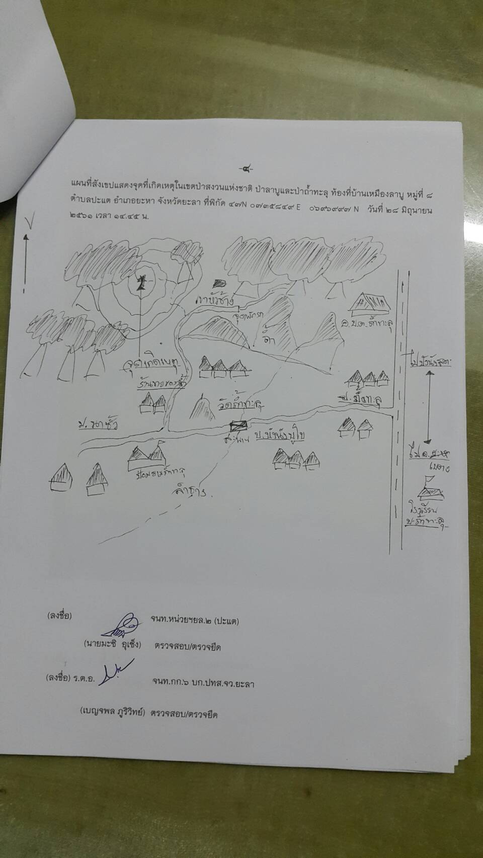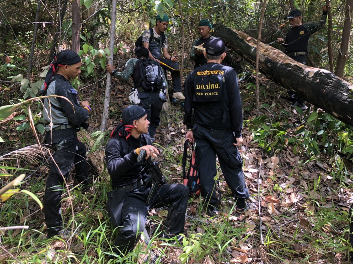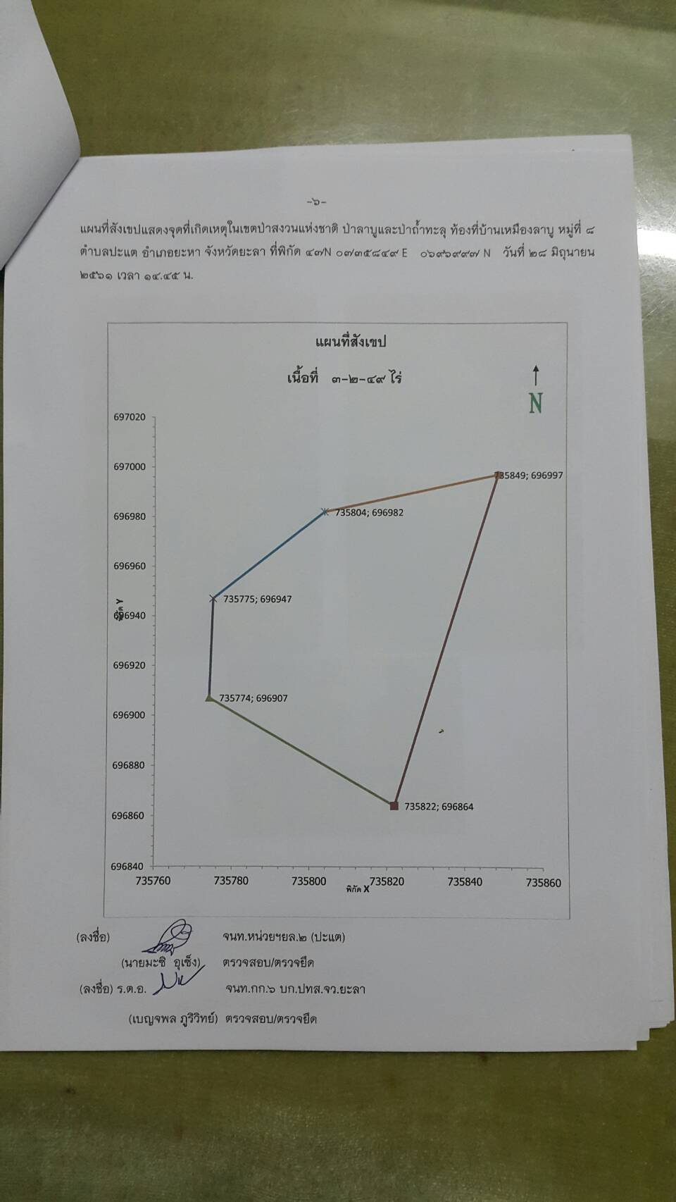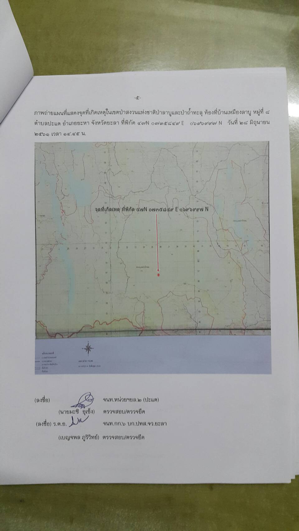 วันพฤหัสบดีที่ 28 มิถุนายน 2561 เวลา 08.๓๐ น. สจป.ที่ 13 สาขานราธิวาส โดยเจ้าหน้าที่หน่วยป้องกันรักษาป่าที่ยล.2 (ปะแต) พร้อมด้วย จนท.สายตรวจปราบปรามฯ กก.๖ บก.ปทส.จ.ยะลา, จนท.ชป.ศปทส.ภ.๙ (ชุดที่ ๒) และ เจ้าหน้าที่ร้อย ทหารพราน ๔๗๑๐ ร่วมกันออกตรวจปราบปรามการกระทำผิดกฏหมายว่าด้วยการป่าไม้ ตามที่ได้รับแจ้งจากร้อย ทพ ๔๗๑๐ ซึ่งได้รับแจ้งจาก สขว.กอ.รมน.ภาค ๔ สน พบมีการลักลอบตัดไม้ทำลายป่าบริเวณพิกัด QH ๓๕๘๙๖๙ บริเวณเขาหัวช้าง ม.๘ บ้านเหมืองลาบู ต.ปะแต อ.ยะหา จ.ยะลา และตามโครงการเพิ่มประสิทธิภาพด้านการป้องกันปราบปรามการบุกรุกและทำลายทรัพยากรธรรมชาติ กองอำนวยการรักษาความมั่นคงภายใน จังหวัดยะลา คณะเจ้าหน้าที่ได้ตรวจสอบบริเวณดังกล่าวตรวจพบพื้นที่ป่าถูกบุกรุกทำลาย จำนวน ๑ จุด เนื้อที่ ๓-๒-๔๙ ไร่ ที่พิกัด ๔๗ N ๐๗๓๕๘๔๙ E ๐๖๙๖๙๙๗ N ในเขตป่าสงวนแห่งชาติป่าลาบูแลป่าถ้ำทะลุ ท้องที่ ม.๘ บ้านเหมืองลาบู ต.ปะแต อ.ยะหา จ.ยะลา และหน่วยฯได้แจ้งความร้องทุกข์ ไว้แล้วที่ สภ.ปะแต ตาม ปจว.ข้อที่ ๒ เวลา ๑๘.๓๐ น คดีที่ ๑๒๓/๒๕๖๑ ลงวันที่ ๒๘ มิถุนายน ๒๕๖๑