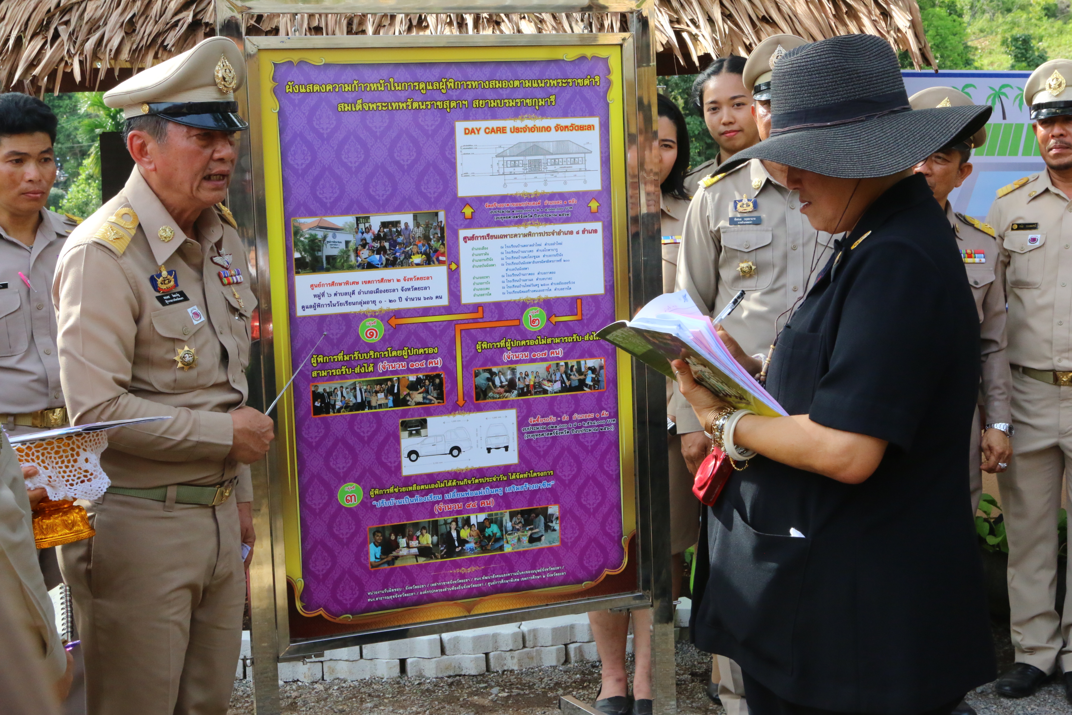 เวลา ๐๙.๑๕ น. ณ ศูนย์การเรียนตำรวจตะเวนชายแดนบ้านภักดี อ.บันนังสตา เวลา ๑๑.๑๕ น. โรงเรียนตำรวจตะเวนชายแดนนิคมพิทักษ์ราษฎร์ อ.บันนังสตา เวลา ๑๔.๑๐ น. โรงเรียนตำรวจตะเวนชายแดนโรงงานยาสูบ ๒ อ.ยะหา ในโอกาสนี้ ผู้ว่าราชการจังหวัด ได้ถวายรายงานเรื่องความก้าวหน้าในการดูแลผู้พิการทางสมองตามแนวพระราชดำริ