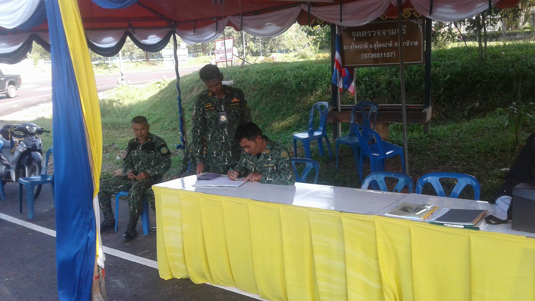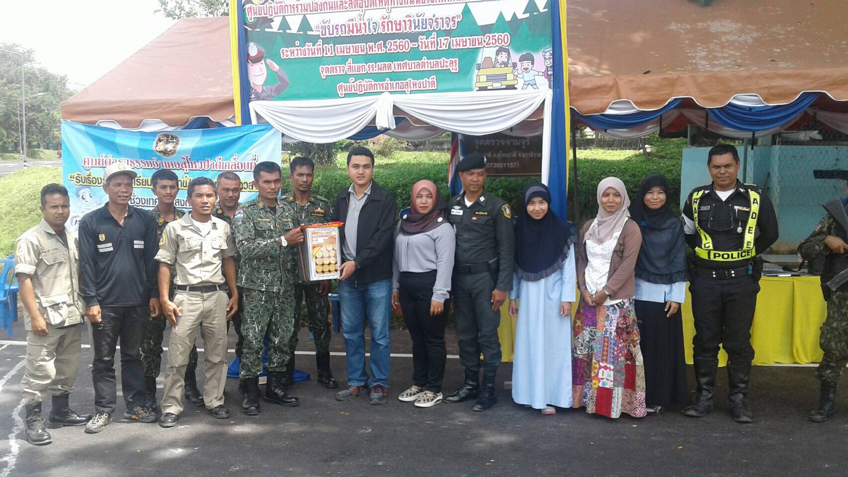 วันนี้ 14/4/60 นายวัลลบ ทองจารุแข พนักงานพิทักษ์ป่า ส.2 และเจ้าหน้าที่หน่วยฯ นธ.4 (สุไหงปาดี) ได้รับมอบหมายจากหัวหน้าหน่วยฯ เข้าร่วมกิจกรรมศูนย์ปฏิบัติการร่วมป้องกันและลดอุบัติเหตุทางถนนช่วงเทศกาลสงกรานต์ พ.ศ.2560 ณ จุดตรวจสี่แยกโรงเรียนมัธยมสุไหงปาดี อำเภอสุไหงปาดี จังหวัดนราธิวาส และหน่วยฯ ได้มอบสิ่งของให้จุดตรวจบริการด้วย
