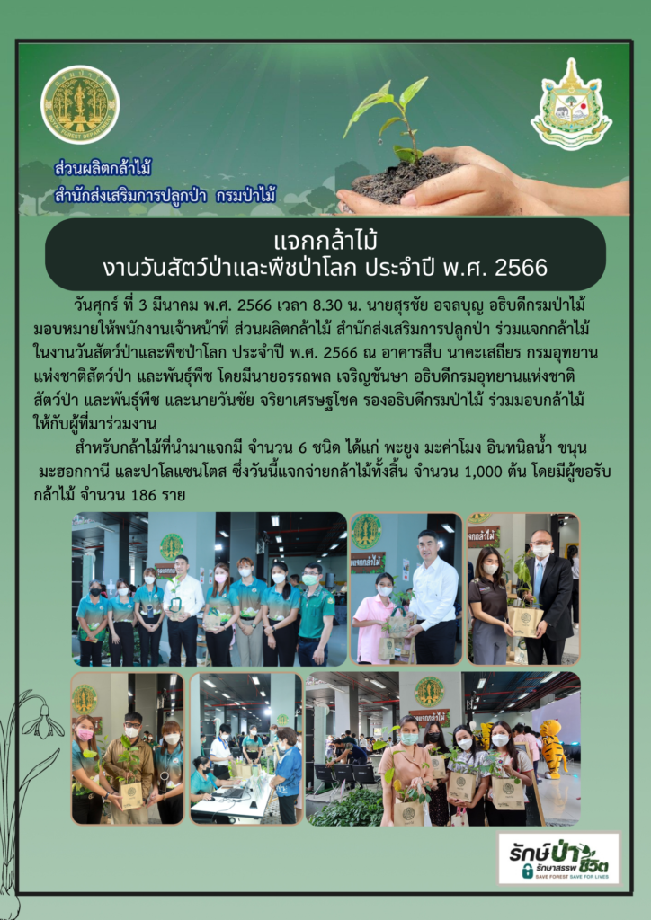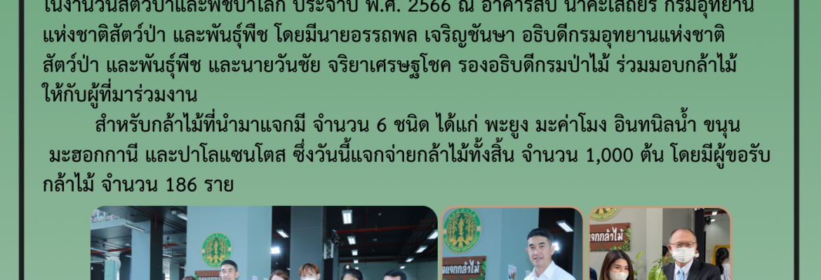 กรมป่าไม้ร่วมแจกกล้าไม้ในงานวันสัตว์ป่าและพืชป่าโลก ประจำปี พ.ศ.2566 ณ อาคารสืบ นาคะเสถียร กรมอุทยานแห่งชาติ สัตว์ป่า และพันธุ์พืช