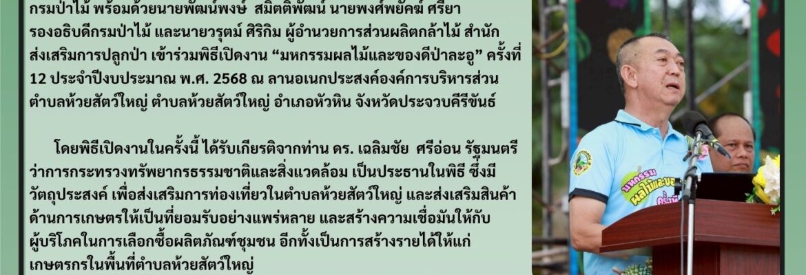 วันจันทร์ที่ ๑๔ กรกฎาคม ๒๕๖๘ เวลา ๐๘.๐๐ น. นายสุรชัย อจลบุญ อธิบดีกรมป่าไม้ พร้อมด้วยนายพัฒน์พงษ์ สมิตติพัฒน์ นายพงศ์พยัฆ์ ศรียา รองอธิบดีกรมป่าไม้ และนายวรุตม์ ศิริกิม ผู้อำนวยการส่วนผลิตกล้าไม้ สำนักส่งเสริมการปลูกป่า เข้าร่วมพิธีเปิดงาน “มหกรรมผลไม้และของดีป่าละอู” ครั้งที่ ๑๒ ประจำปีงบประมาณ พ.ศ. ๒๕๖๘ ณ ลานอเนกประสงค์องค์การบริหารส่วนตำบลห้วยสัตว์ใหญ่ ตำบลห้วยสัตว์ใหญ่ อำเภอหัวหิน จังหวัดประจวบคีรีขันธ์