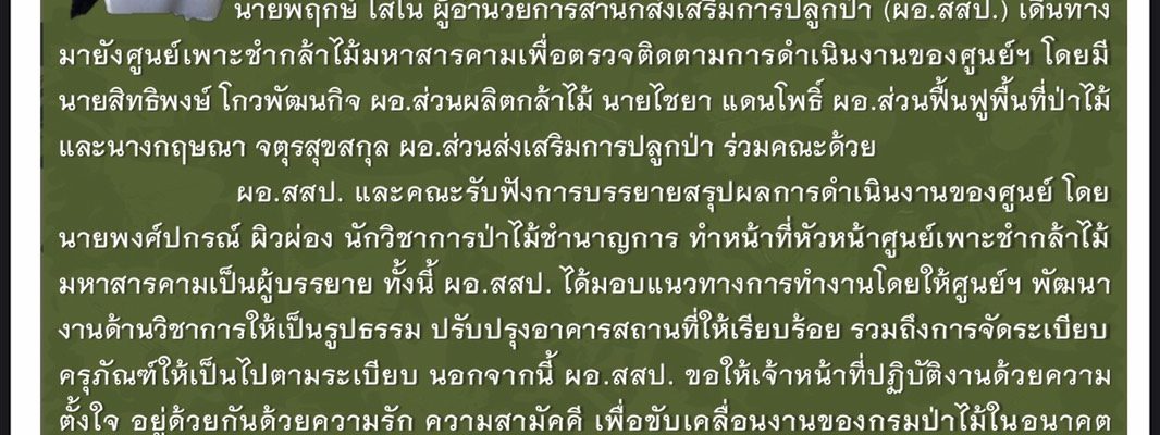 ผอ.สสป. และคณะรับฟังการบรรยายสรุปผลการดำเนินงานของศูนย์ฯ โดยนายพงศ์ปกรณ์ ผิวผ่อง หัวหน้าศูนย์เพาะชำกล้าไม้มหาสารคามเป็นผู้บรรยาย ทั้งนี้ ผอ.สสป. ได้มอบแนวทางการทำงานโดยให้ศูนย์ฯ พัฒนางานด้านวิชาการให้เป็นรูปธรรม ปรับปรุงอาคารสถานที่ให้เรียบร้อย รวมถึงการจัดระเบียบครุภัณฑ์ให้เป็นตามระเบียบ นอกจากนี้ ผอ.สสป.ขอให้เจ้าหน้าที่ปฏิบัติงานด้วยความตั้งใจ อยู่ด้วยกันด้วยความรัก ความสามัคคี เพื่อขับเคลื่อนงานของกรมป่าไม้ในอนาคต ในการนี้ ผอ.สสป. ได้ตรวจงานภาคสนามทั้งในส่วนของอาคารสำนักงาน และเรือนเพาะชำ ร่วมถ่ายภาพกับเจ้าหน้าที่ศูนย์ฯ และร่วมเพาะชำต้นรวงผึ้งเพื่อเป็นที่ระลึกให้ศูนย์ฯ ด้วย