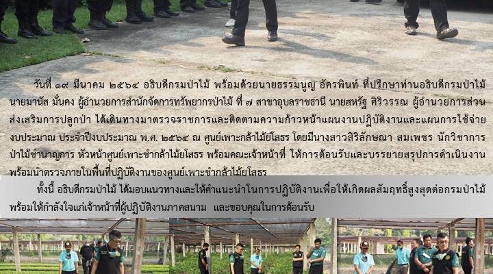 วันศุกร์ที่ ๑๙ มีนาคม ๒๕๖๔ นายอดิศร นุชดำรงค์ อธิบดีกรมป่าไม้ พร้อมด้วยนายธรรมนุญ อัครพินท์ ที่ปรึกษาอธิบดีกรมป่าไม้ นายมานัส มั่นคง ผู้อำนวนการสำนักจัดการทรัพยากรป่าไม้ ที่ ๗ สาขาอุบลราชธานี นายสหรัฐ ศิริวรรณ ผู้อำนวยการส่วนส่งเสริมการปลูกป่า ได้เดินทางมาตรวจราชการและติดตามความก้าวหน้าแผนงานปฏิบัติงานและแผนการใช้จ่ายเงินงบประมาณ ประจำปีงบประมาณ พ.ศ.๒๕๖๔ ณ ศูนย์เพาะชำกล้าไม้ยโสธร โดยมีนางสาวสิริลักษณา สมเพชร หัวหน้าศูนย์เพาะชำกล้าไม้ยโสธร พร้อมคณะเจ้าหน้าที่ ให้การต้อนรับและบรรยายสรุปผลการดำเนินงาน พร้อมนำตรวจภายในพื้นที่ปฏิบัติงานของศูนย์เพาะชำกล้าไม้ยโสธร