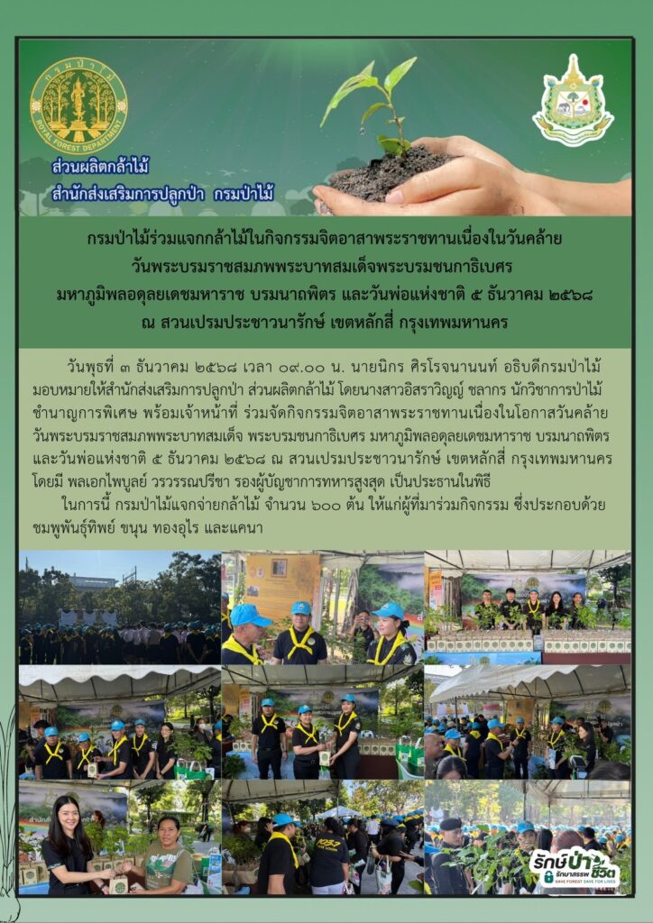 หน้าแรก » ข่าวประชาสัมพันธ์ » กรมป่าไม้ร่วมแจกกล้าไม้ในกิจกรรมจิตอาสาพระราชทาน เนื่องในวันคล้ายวันพระราชสมภพ พระบาทสมเด็จพระบรมชนกาธิเบศร มหาภูมิพลอดุลยเดชมหาราช บรมนาถบพิตร และวันพ่อแห่งชาติ ๕ ธันวาคม ๒๕๖๘ ณ สวนเปรมประชาวนารักษ์ เขตหลักสี่ กรุงเทพฯ