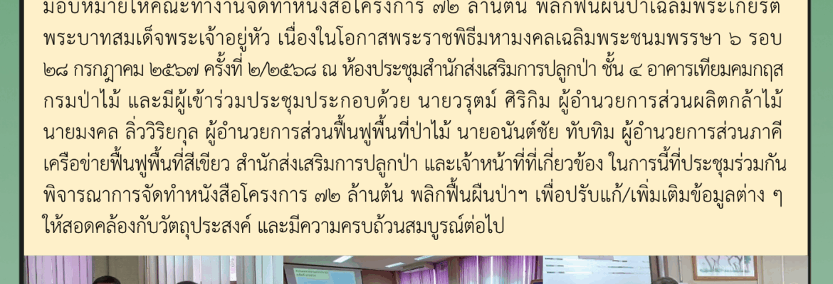 วันจันทร์ที่ ๗ กรกฎาคม ๒๕๖๘ นายอนันต์ ปิ่นน้อย ผู้อำนวยการสำนักส่งเสริมการปลูกป่า มอบหมายให้คณะทำงานจัดทำหนังสือโครงการ ๗๒ ล้านต้น พลิกฟื้นผืนป่าเฉลิมพระเกียรติพระบาทสมเด็จพระเจ้าอยู่หัว เนื่องในโอกาสพระราชพิธีมหามงคลเฉลิมพระชนมพรรษา ๖ รอบ ๒๘ กรกฎาคม ๒๕๖๗ ครั้งที่ ๒/๒๕๖๘ ณ ห้องประชุมสำนักส่งเสริมการปลูกป่า ชั้น ๔ อาคารเทียมคมกฤส กรมป่าไม้ และมีผู้เข้าร่วมประชุมประกอบด้วย นายวรุตม์ ศิริกิม ผู้อำนวยการส่วนผลิตกล้าไม้ นายมงคล ลิ่ววิริยกุล ผู้อำนวยการส่วนฟื้นฟูพื้นที่ป่าไม้ นายอนันต์ชัย ทับทิม ผู้อำนวยการส่วนภาคีเครือข่ายฟื้นฟูพื้นที่สีเขียว สำนักส่งเสริมการปลูกป่า และเจ้าหน้าที่ที่เกี่ยวข้อง ในการนี้ ที่ประชุมร่วมกันพิจารณาการจัดทำหนังสือโครงการ ๗๒ ล้านต้น พลิกฟื้นผืนป่า ฯ เพื่อปรับแก้/เพิ่มเติมข้อมูลต่าง ๆ ให้สอดคล้องกับวัตถุประสงค์ และมีความครบถ้วนสมบูรณ์ต่อไป
