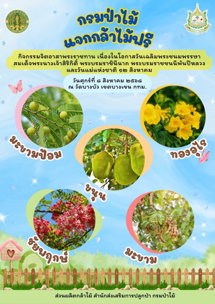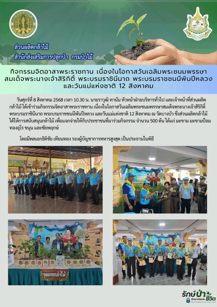 กรมป่าไม้ร่วมแจกกล้าไม้ในงานจิตอาสาพระราชทาน เนื่องในโอกาสวันเฉลิมพระชนมพรรษา สมเด็จพระนางเจ้าสิริกิติ์ พระบรมราชินีนาถ พระบรมราชชนนีพันปีหลวง และวันแม่แห่งชาติ ๑๒ สิงหาคม ณ วัดบางบัว เขตบางเขนกรุงเทพฯ8 สิงหาคม 2025 by nursery