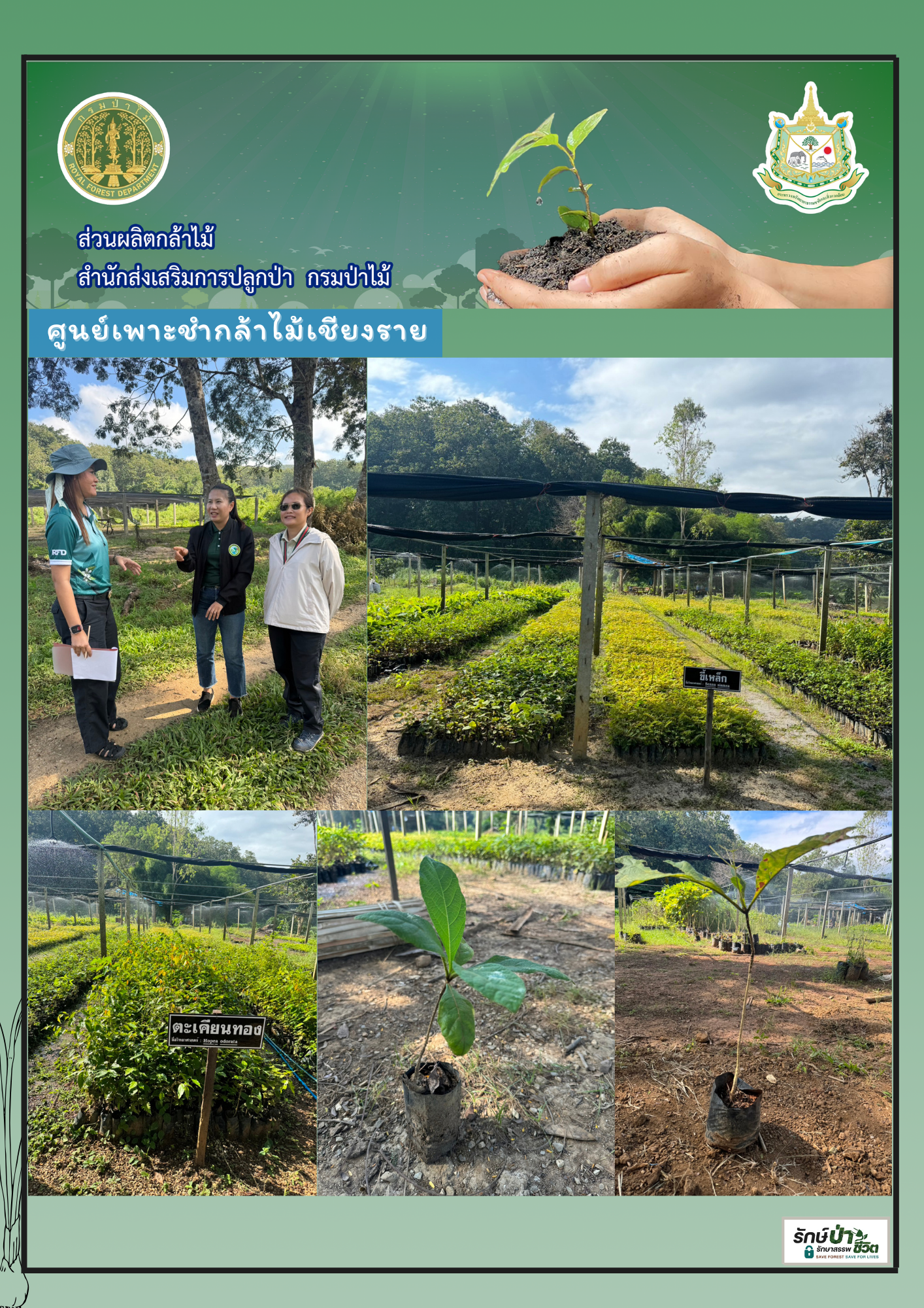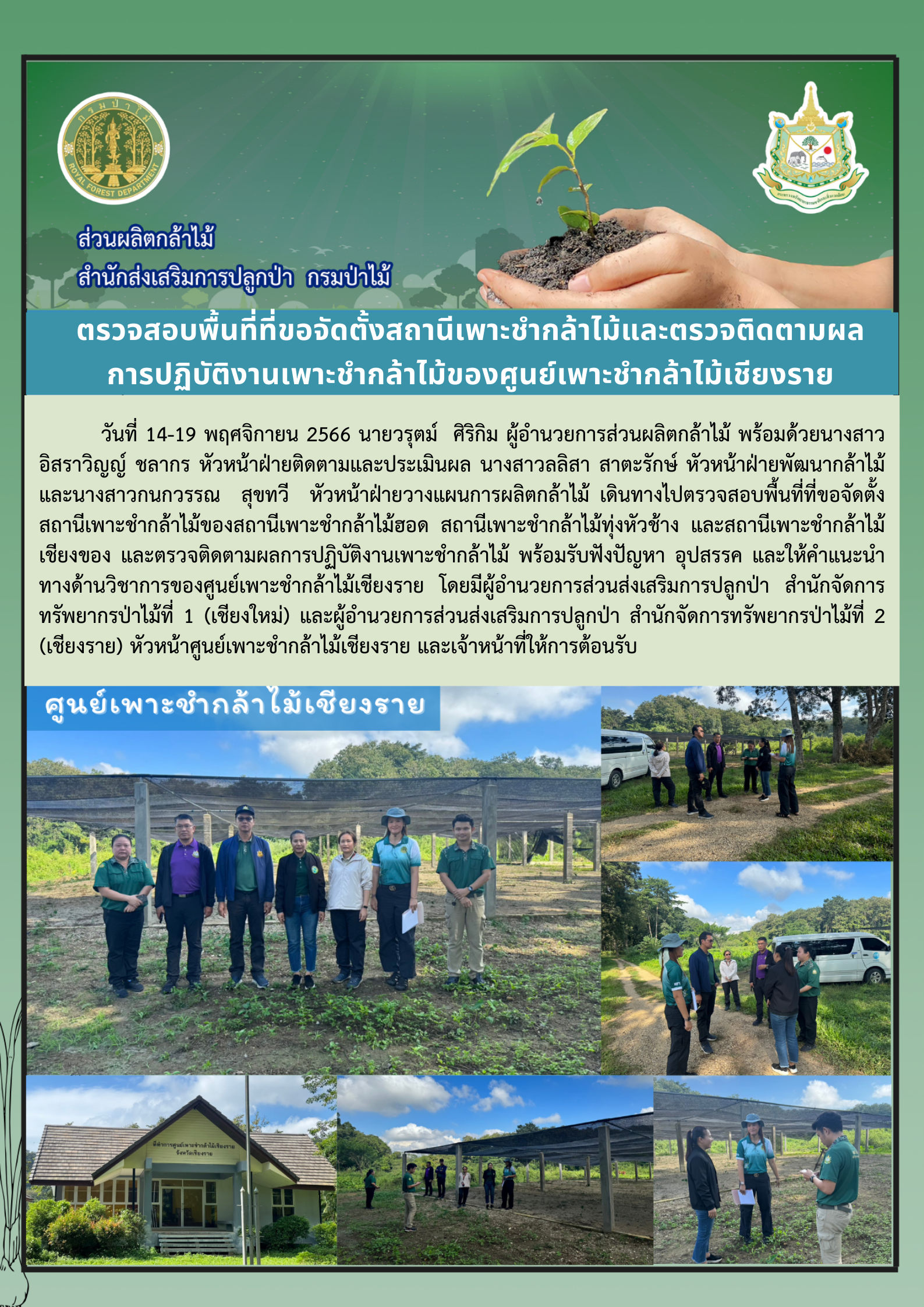 หน้าแรก » ข่าวประชาสัมพันธ์ » ส่วนผลิตกล้าไม้ร่วมตรวจพื้นที่ที่ขอจัดตั้งสถานีเพาะชำกล้าไม้ท้องที่จังหวัดเชียงใหม่ ลำพูน เชียงราย และตรวจติดตามผลการปฏิบัติงานเพาะชำกล้าไม้ของศูนย์เพาะชำกล้าไม้เชียงราย ระหว่างวันที่ ๑๔-๑๙ พฤศจิกายน ๒๕๖๖