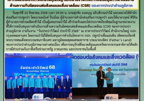 กรมป่าไม้รับมอบโล่ประกาศเกียรติคุณในฐานะหน่วยงานที่ให้การสนับสนุนการดำเนินงานด้านความรับผิดชอบต่อสังคมและสิ่งแวดล้อม (CRS) ของการประปาส่วนภูมิภาค ในงาน “วันประปาวิวัฒน์ ประจำปี ๒๕๖๘”23 สิงหาคม 2025 by nursery